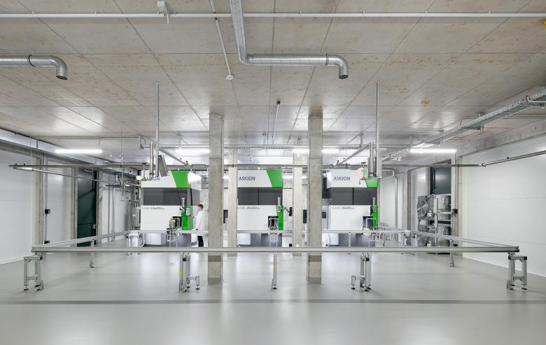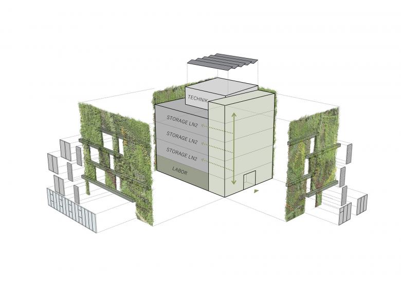 The only openings in the upper stories are those required for functional reasons: access openings for the storage containers, vents for supply and exhaust air, windows in the stairwell and emergency exits with ladders. The nitrogen is stored in an exterior tank which, while separate from the building, is integrated into its skin.