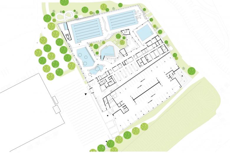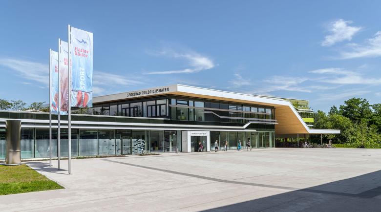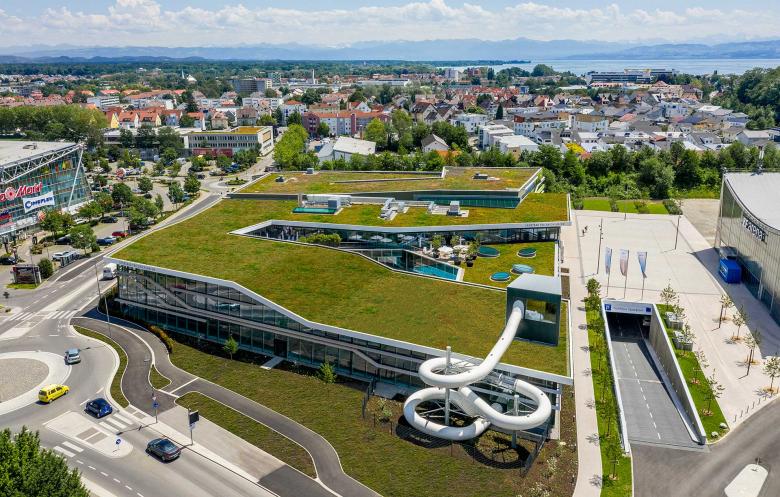 The ensemble of buildings has been constructed on the Sportpark site, which used to host the trade fair. Situated right next to the ZF-Arena, the complex houses Friedrichshafen’s new aquatic sports center as well as a parking garage. This new urban element is an exceptional addition to the structural landscape with its exciting, playful formal vocabulary, and provides an extra aquatic attraction for Friedrichshafen. The heart of the complex is the landscaped interior courtyard—an oasis of recuperation and relaxation that forms a central focal point in the building. This is the source of the center’s unique identity, where it develops its qualities from within.