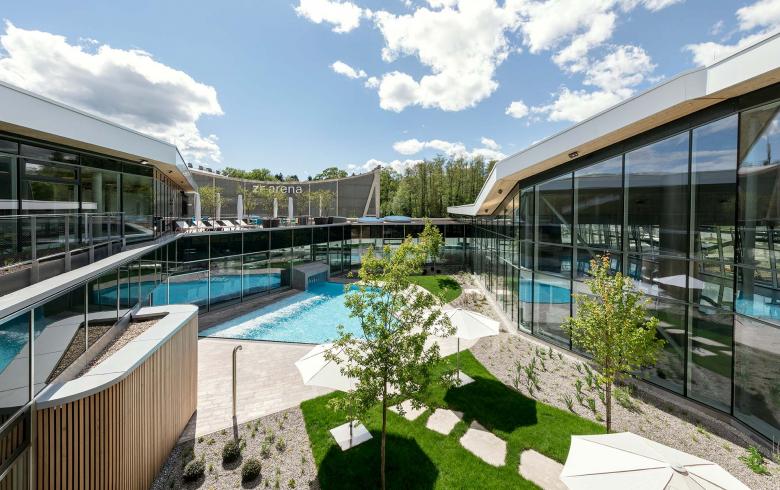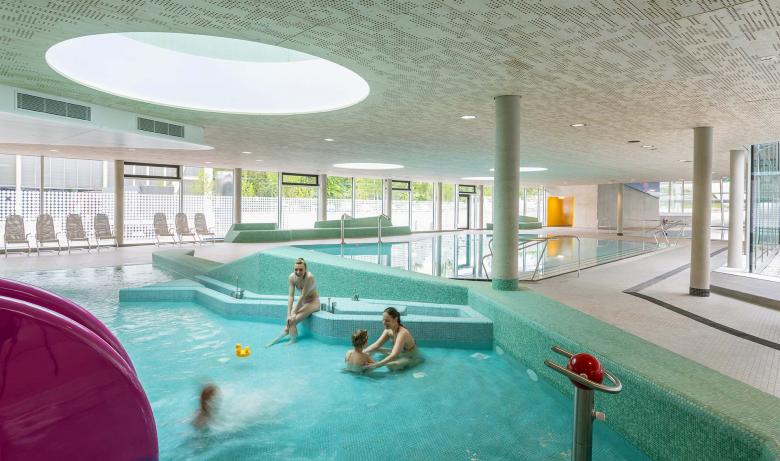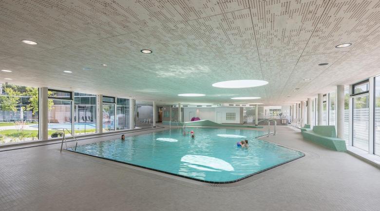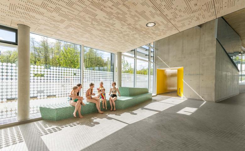 From the outside this wonderful world is only discreetly discernible, although it never seems too heavily screened. It can only really be experienced when visitors step through to the interior: an open-air section with patios and a sauna garden is revealed on multiple levels as an abundantly planted garden, enclosed from all sides. Arranged around this interior courtyard are the bathing areas, with a textile steam bath (swimsuits required), the external swimming channel to the saltwater pool, an area for babies and toddlers featuring various attractions, a learners’ pool, a swimmers’ pool, and an eighty-meter water slide.