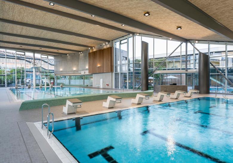 The swimming area has the open and transparent character of a bathing complex, suffused with light. The cool color scheme is pleasantly stimulating during athletic activities—a restrained backdrop that skillfully helps draw attention to the unique nature of the garden. The sauna world on the upper level successfully integrates various kinds of sauna, innovative shower experiences, a plunge pool, assorted quiet spaces featuring different moods, and a room with an open hearth—all adding up to the perfect conditions for hours of relaxation.