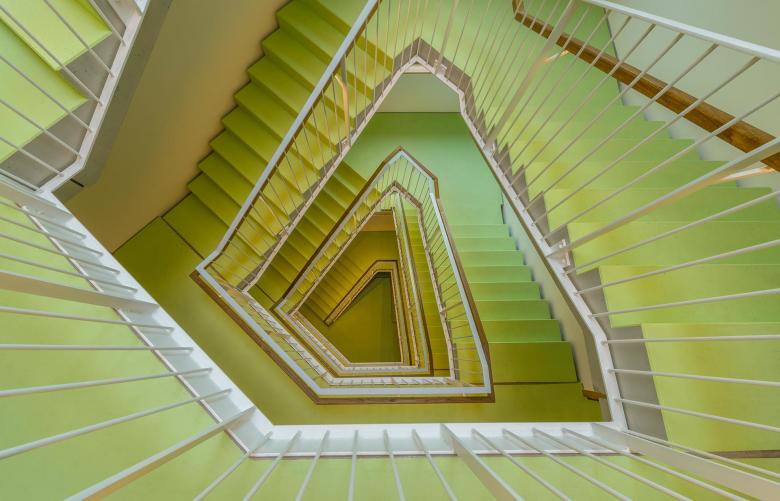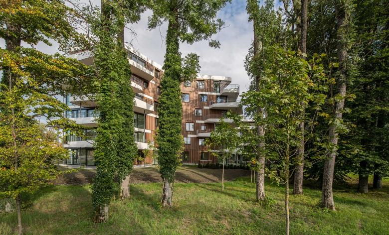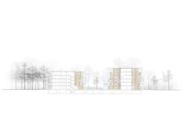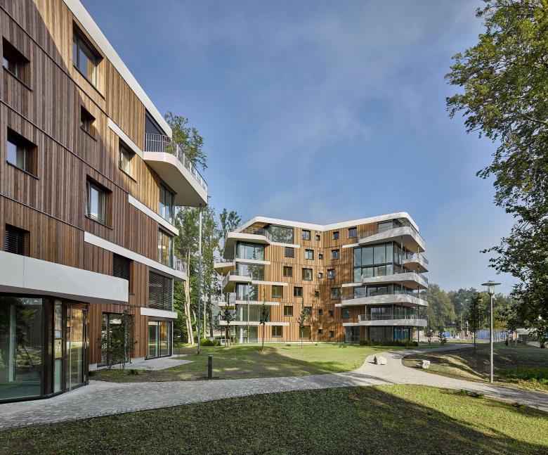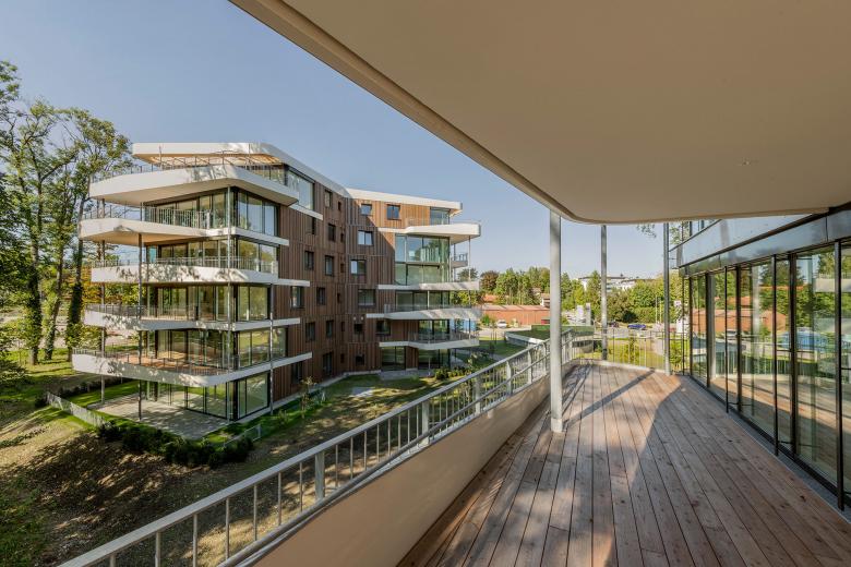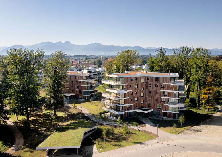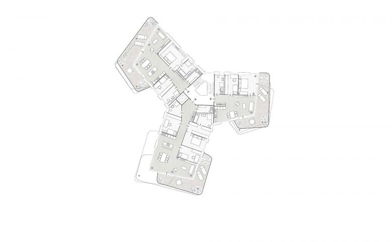 Designed as stand-alone buildings, the Y-houses take full advantage of their respective situation in the park. An important aspect when deciding on the location and orientation of each building was to protect as many of the existing trees in the park as possible; sight lines to the Alps, the park with its pond, the rope climbing net and Rose Garden were established. The five- to six-storied building volumes were developed from a solid core, which visually increasingly dissolve towards their far end and interlock with the surrounding landscape by virtue of randomly arranged balconies. Thanks to the Y-shape of the building foot print, every apartment benefits from natural light on three sides and its specific situation with respect to the surrounding trees, the sunlight exposure and views. As an extension of the floor space available for living, the balconies of each story project out differently from the building, fully respecting the specific floor plan of each apartment and as well as its exposure to sunlight.