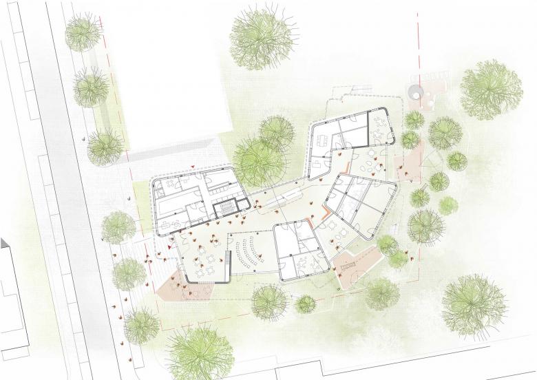 The design of the new building should enable the subsequent day-care center to take maximum advantage of the natural qualities of the nearby green space. The ideal location to achieve this is the lot on the eastern border of the Pioneer Quarter, directly adjacent to the Kleine Bulau forest. The site has a total area of more than 10,000 m²: its northern portion is to house a three-room primary school with a gymnasium, while the southern part will be given over to a day-care center providing space for 155 children aged six and under.