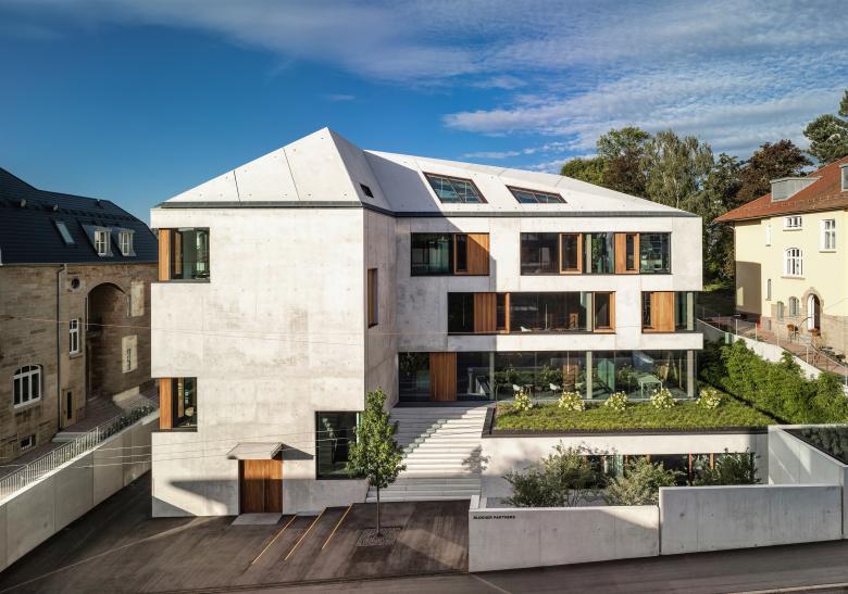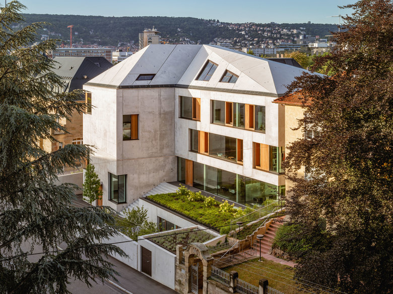 Die Anforderungen an ein zeitgemäßes Bürogebäude sind mannigfaltig. Das gilt umso mehr, wenn unterschiedliche Disziplinen sich unter einem Dach wohlfühlen sollen wie in diesem Fall: Neben dem Büro für Architektur und Innenarchitektur gehören eine Gesellschaft für die Entwicklung von Monomarken-Konzepten sowie eine Agentur für Kommunikation, Corporate Design und Visual Merchandising zur Unternehmensgruppe. Die städtebaulich heterogene Situation im Herdweg nutzten die Architekten, um einen Solitär zu setzen. Schlicht, jedoch markant. Ein Blickfang, der Passanten und Autofahrer gleichermaßen in seinen Bann zu ziehen vermag. Dem robusten Charme des Sichtbetons - als zweischalige Betonfassade mit Kerndämmung ausgeführt - schmeichelt die ätherische Transparenz großzügiger Fensterbänder. Holzelemente aus Sipo Mahagoni gliedern übergeordnet und geben der Fassade Tiefe. Die klaren Linien bringen sowohl Ordnung als auch Dynamik in die Fassade. Charakteristisch für die Stahlbetonbauweise ist die Dachkonstruktion, ein räumliches Faltdach, das das klassische Satteldach neu interpretiert.
