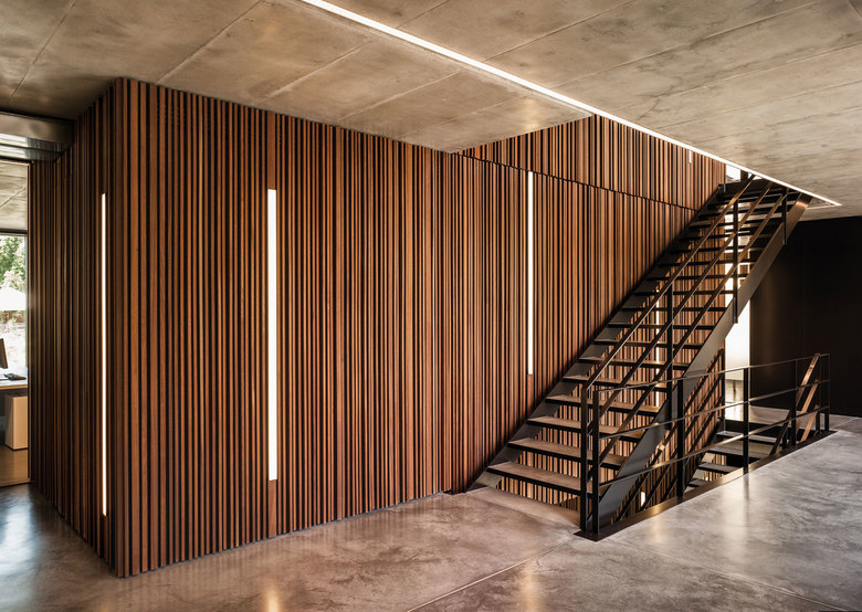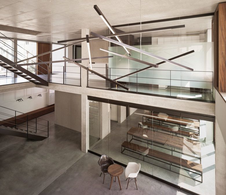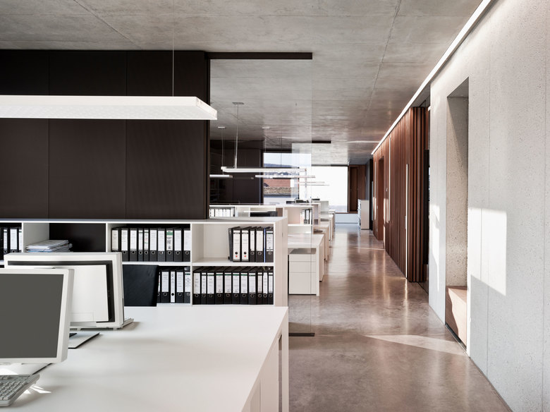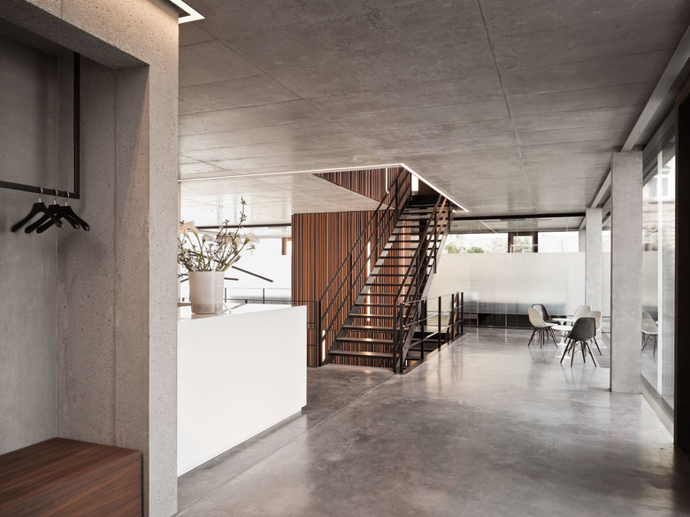 Das Bürogebäude besteht aus drei Vollgeschossen, einem Garten-, einem Dach- sowie einem Untergeschoss. Die Schlichtheit der inneren Gestaltung mit den sandgestrahlten Flächen aus Beton und Sichtbeton sowie dem Bodenbelag aus Zement-Estrich steht im Gleichklang mit dem äußeren Auftritt. Die offene, dennoch klare Raumaufteilung lässt die Grenzen zwischen den Arbeitsbereichen verschwinden.