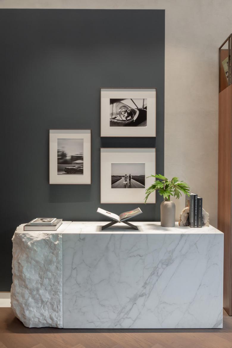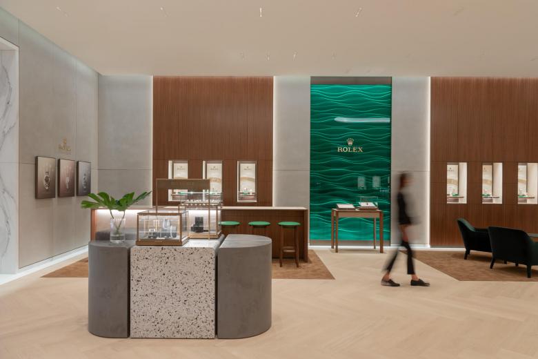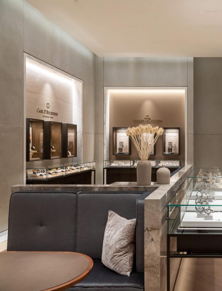 Gelangen die Besucher über eine schmale Passage zum Eingang des Stores, empfängt sie im Inneren eine fast schon monumentale Weite. Über vier Meter hohe Decken und eine gänzlich offen gestaltete Verkaufsfläche, die im Erdgeschoss Marken wie Rolex, Cartier und Omega vorbehalten ist, gibt den Uhren Raum, ihre Strahlkraft vollkommen zu entfalten. Portale aus weißem Marmor verkürzen die Perspektive, gliedern den Raum und verleihen ihm trotz seiner Weite im ersten Obergeschoss eine wohnliche Anmutung. Die markeneigenen Möblierungen haben die Innenarchitekten durch Mittelmöbel aus Terrazzo und Sichtbeton ergänzt, die die Ware gleich eines Kunstwerks inszenieren. Pflanzen und sorgfältig kuratierte Wohnaccessoires unterstützen die Wohlfühlatmosphäre.