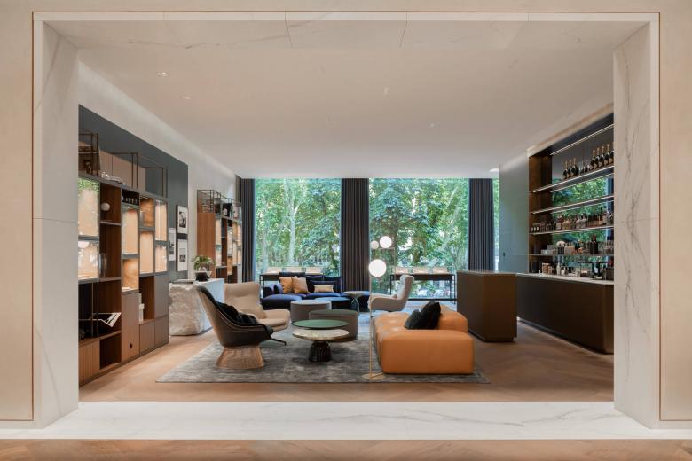 Im Loungebereich des oberen Stockwerks erfährt die neue Wohnlichkeit des Stores ihren Höhepunkt: Die Luxusuhren werden hier neben Literatur und Vasen in Vitrinen aus Messing zur Schau gestellt, ein behauener Marmorblock dient als Präsentation weiterer Wohnaccessoires. Verkaufsgespräche in legerer Atmosphäre oder Momente der Entspannung bieten die Sofalandschaften und Sessel vor einer großen Panoramafront mit direktem Blick auf die Kö. Abgerundet wird das exklusive Einkaufserlebnis durch einen Aperitif, der den Besuchern an der hauseigenen Bar serviert wird.