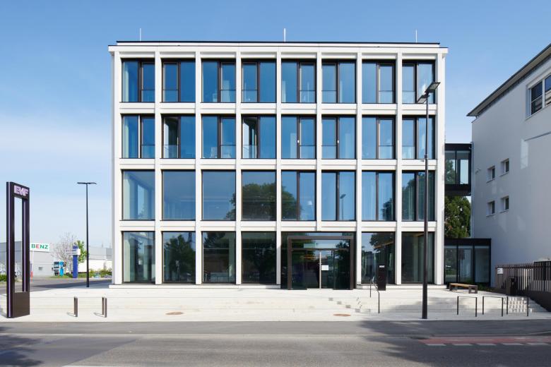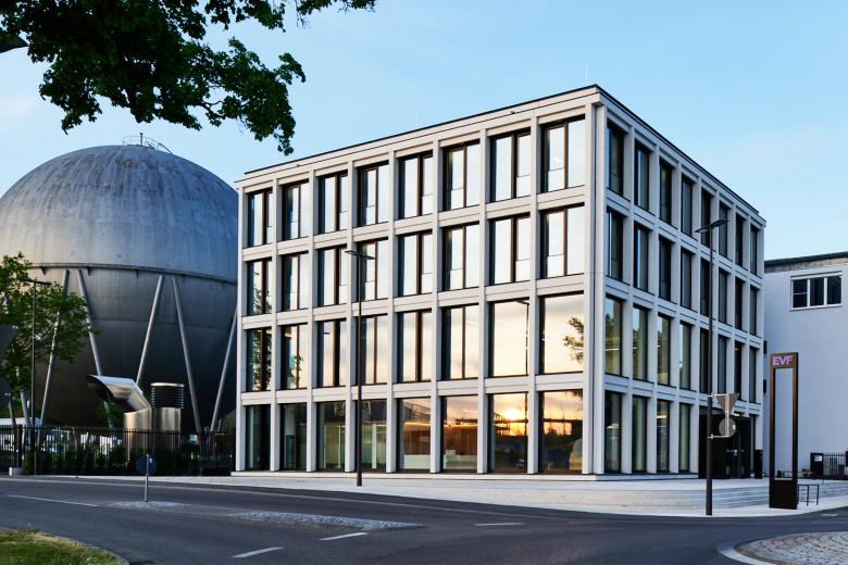 Das Bestandsgebäude der Energieversorgung Filstal (EVF) in Göppingen nimmt nach einer Sanierung den kommunikativen Charakter des 2020 neueröffneten Verwaltungsgebäudes auf: offen, einladend und identitätsstiftend.
