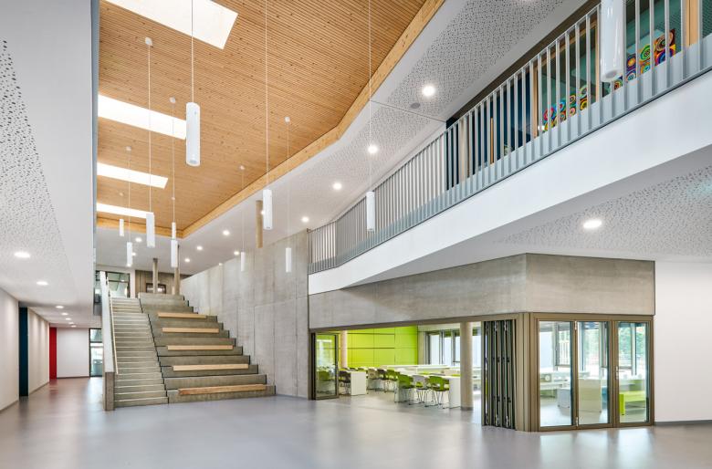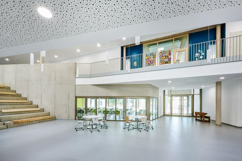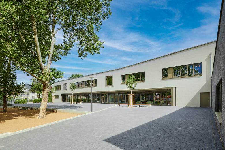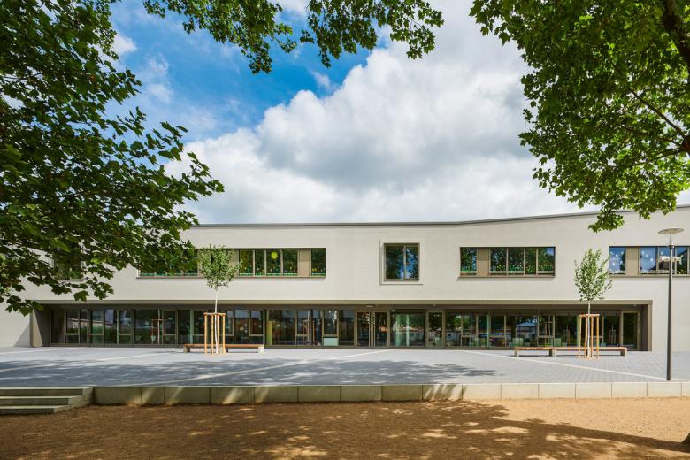 Ganztagsbetreuung, Inklusion und selbstbestimmte Lernformen verändern den Schulalltag und damit den Raumbedarf der Schulen. Der Neubau der Hemsbacher Hebelschule integriert diese zeitgemäßen Ansprüche in seinen Entwurf – und ersetzt einen Bestandsbau aus den 1970er Jahren. Als kompaktes, zweigeschossiges Volumen konzipiert, orientiert sich die dreizügige Grundschule mit einer Glasfassade zum Pausenhof. Die Erschließungsräume sind als Aufenthaltsbereiche aufgewertet und für die soziale Interaktion gestaltet. Herzstück ist das Foyer, das mit einem lichtdurchfluteten Luftraum und hoher Aufenthaltsqualität den Schülern ein starkes Identitätsgefühl zu vermitteln vermag. Mensa, Turnhalle und multifunktionale Räume für freies Lernen ergänzen das Angebot. Mit dem Entwurf gelingt es den Architekten, zwischen ambitioniertem Raumanspruch und kostenbewusstem Budget zu vermitteln.