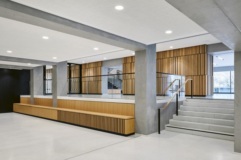 Vollverglast und zweigeschossig macht auch die neue Eingangshalle Eindruck. Ihre Offenheit vermittelt Transparenz und lädt ein. Sie unterstricht damit die Funktion einer Stadthalle, ein Ort für alle Bürger zu sein. Mit einem klugen Kniff erreichen die Architekten, die Großzügigkeit im Innern fortzuführen: Die Infrastruktur und Sanitäranlagen haben sie im Foyer im Untergeschoss mit ebenerdigem Zugang zur Tiefgarage integriert, sämtliche Bereiche werden barrierefrei erschlossen.