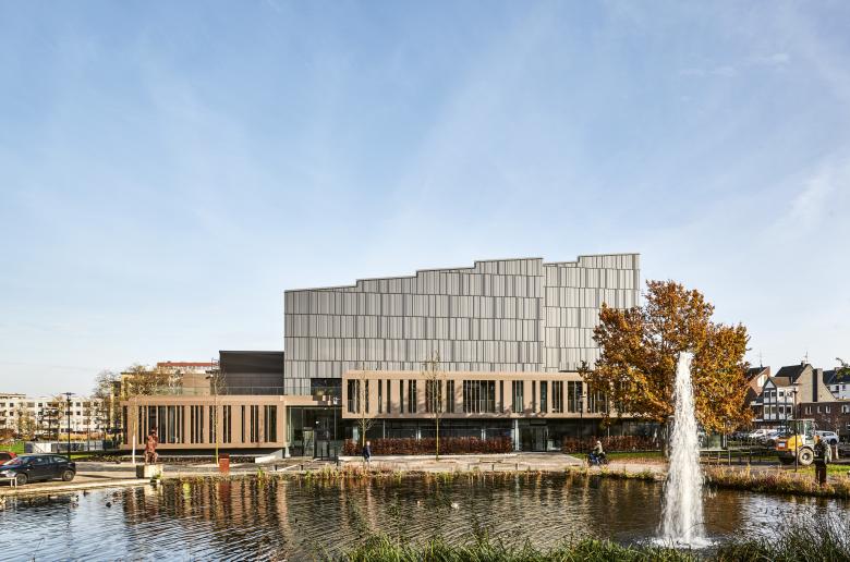 Durch einen Sprung in der Fassade entsteht der Eindruck, das Gebäude neige sich in Richtung des gegenüberliegenden Rathauses. Fast scheint es als würden sie miteinander in einen Dialog treten. Die vertikalen, rotbraunen Lamellen der Fassade nehmen dabei die Kleingliedrigkeit sowie die Farbgebung des städtischen Kontexts auf.