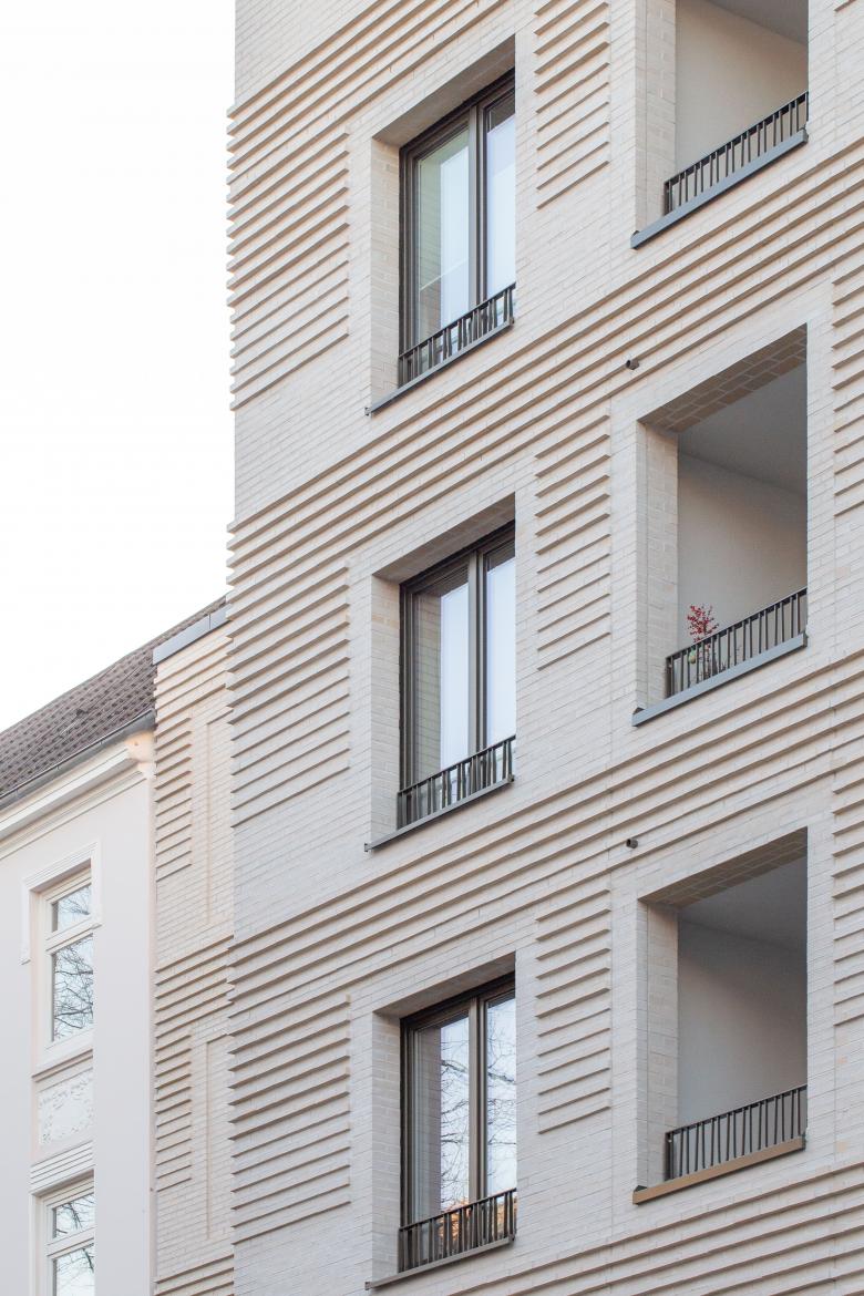 Zum Straßenraum hin erzeugt die Lochfassade mit hellgrauem Klinker, durch die Reduktion auf wenige, sich wiederholende Motive, ein ruhiges und homogenes Erscheinungsbild. Abermals wird zwischen dem neuen Eckgebäude und der Nachbarbebauung vermittelt, indem das Material der Bebauung an der Müggenkampstraße und die Farbe des hellgrauen Putzes der Nachbarbebauung an der Sartoriusstraße zitiert wird. Das Mauerwerk wird in seiner horizontalen Gliederung gestärkt, indem geschossweise aus der glatten Klinkerfläche jede zweite Läuferschicht hervortritt. Um die Wandöffnungen bilden sich dabei als Referenz zur gründerzeitlichen Fassadengestaltung Faschen. Entlang der Brüstungsebenen interpretiert die Längsprofilierung der hervortretenden Läuferschichten klassische Gurtgesimse während sie im Hochparterre einen massiven Sockel bildet.