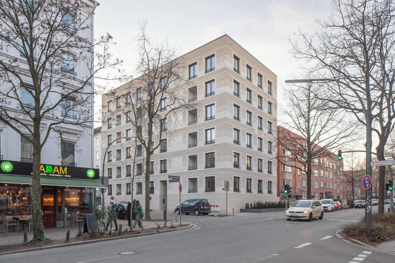 Das homogene Wohnviertel um die Sartoriusstraße weist überwiegend typische Hamburger Rotklinkergebäude auf, als auch gründerzeitliche Bauten. Auf dem Eckgrundstück hinterließ der Abbruch eines Hochbunkers eine Baulücke, die durch den sechsgeschossigen Wohnungsbau mit Anbindung an die Nachbargebäude an der Sartoriusstraße und der Müggenkampstraße geschlossen wird. Der monolithisch wirkende Baukörper gewinnt durch subtraktive Eingriffe an der Gebäudekubatur, vor- und Rücksprünge, an Dynamik und vermittelt so zwischen alt und neu.