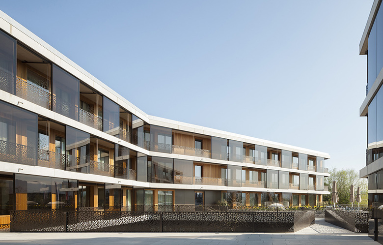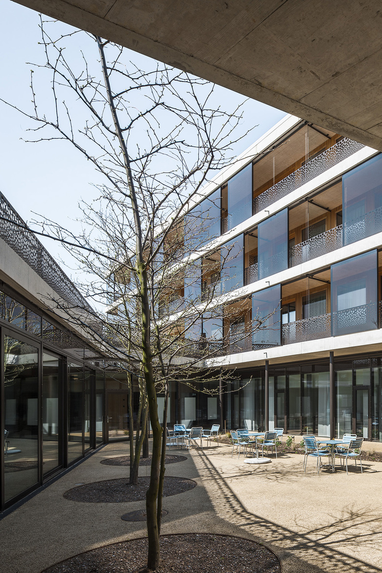 Der grosszügige Vorplatz wird zur attraktiven Adresse und zum hochwertigen Aufenthaltsort, während der atmosphärische Innenhof zur Orientierung und als Tageslicht-Laterne dient. Die sensible Einbindung in die Topographie bietet den Wohneinheiten individuelle Zugänge zur praktisch unversehrten Parklandschaft.