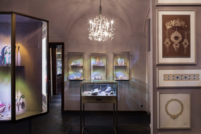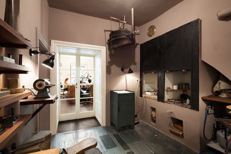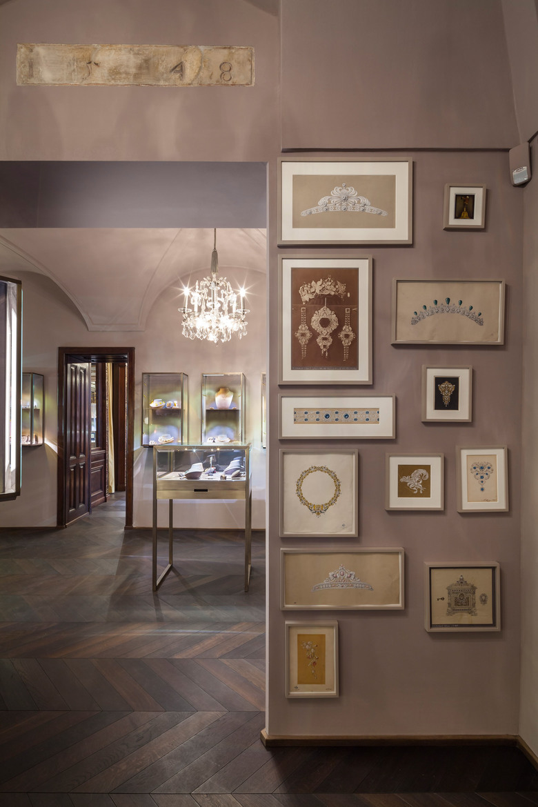 Innenausstattung eines Wiener Traditionsjuweliers: Geschäftslokal, Werkstätte und Kundenzone im 1. Obergeschoß.