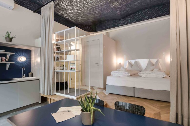 Die Suiten gleichen kleinen Wohnungen. Ihre Gestaltung folgt einem urbanen Stil des situativen Reflektierens der Umgebung: In geschmackvolles, hochwertiges Design wurden lokale Elemente integriert. Alle Suiten verfügen über ein hohes Ausstattungsniveau und sind in ihrer Atmosphäre und Gestaltung individuell wie die Gäste des grätzlhotels.