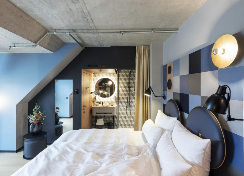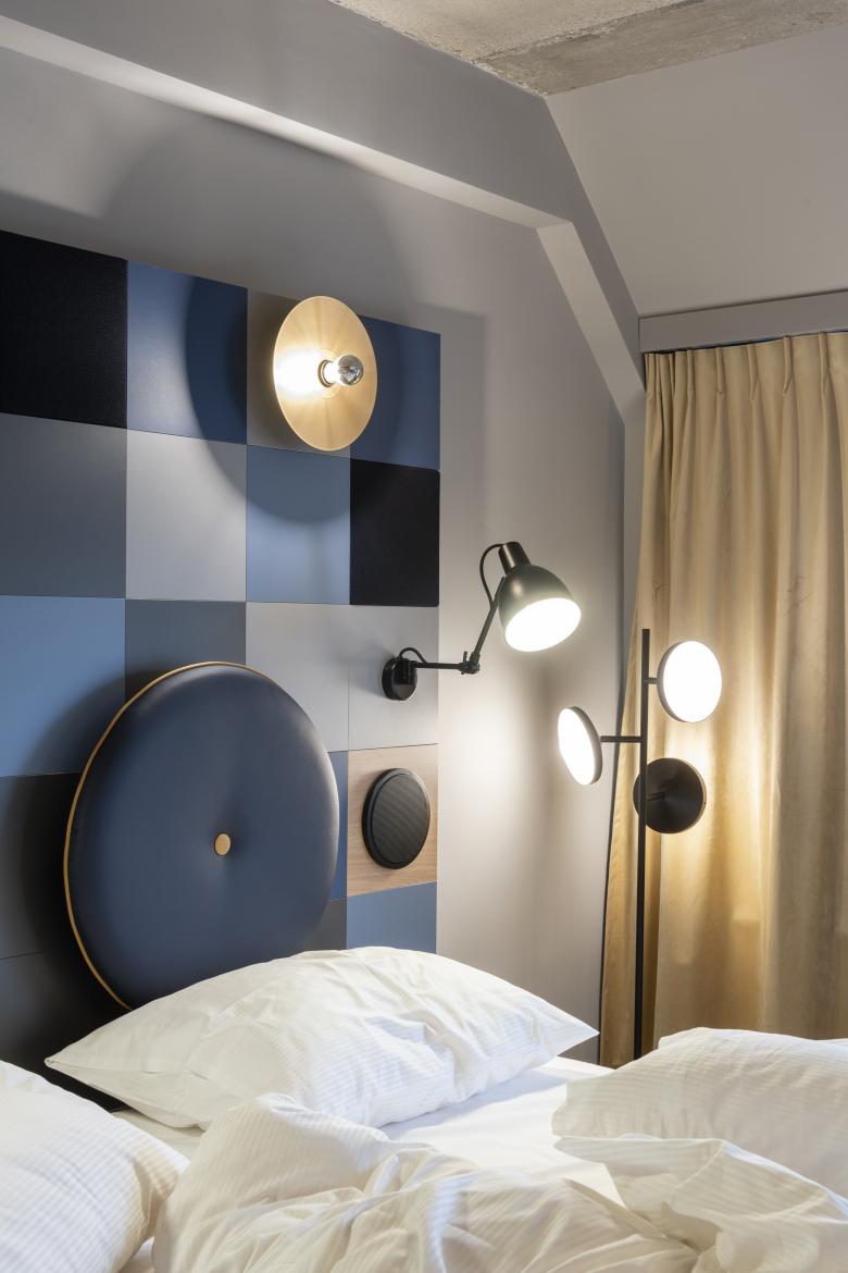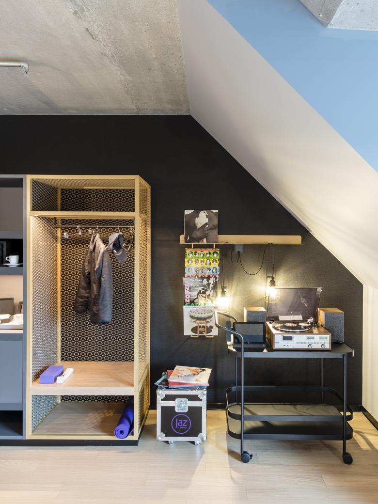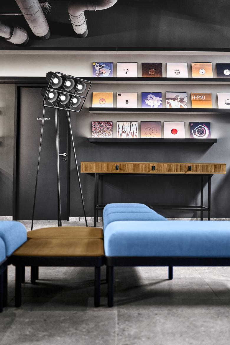 Zu den 163 Zimmern gelangt man durch Flure, die den Eingängen zu Musikclubs nachempfunden sind und optisch das Sujet des Verstärkers aufgreifen, während auch in ihrem Inneren das Thema Musik auf unübersehbare Weise die Hauptrolle spielt. „Die Zimmer bieten ein Ambiente, in das sich die Musiker einfühlen können“, erklärt Architekt Bernard, „in denen man unplugged üben und sich in die Atmosphäre eines Auftritts hineindenken kann.“ Auch verfügt jedes Zimmer über seinen eigenen Plattenspieler, sodass auch Gäste, die nicht gerade üben müssen, Schallplatten etwa aus dem hauseigenen und gutsortierten Record store hören können.
