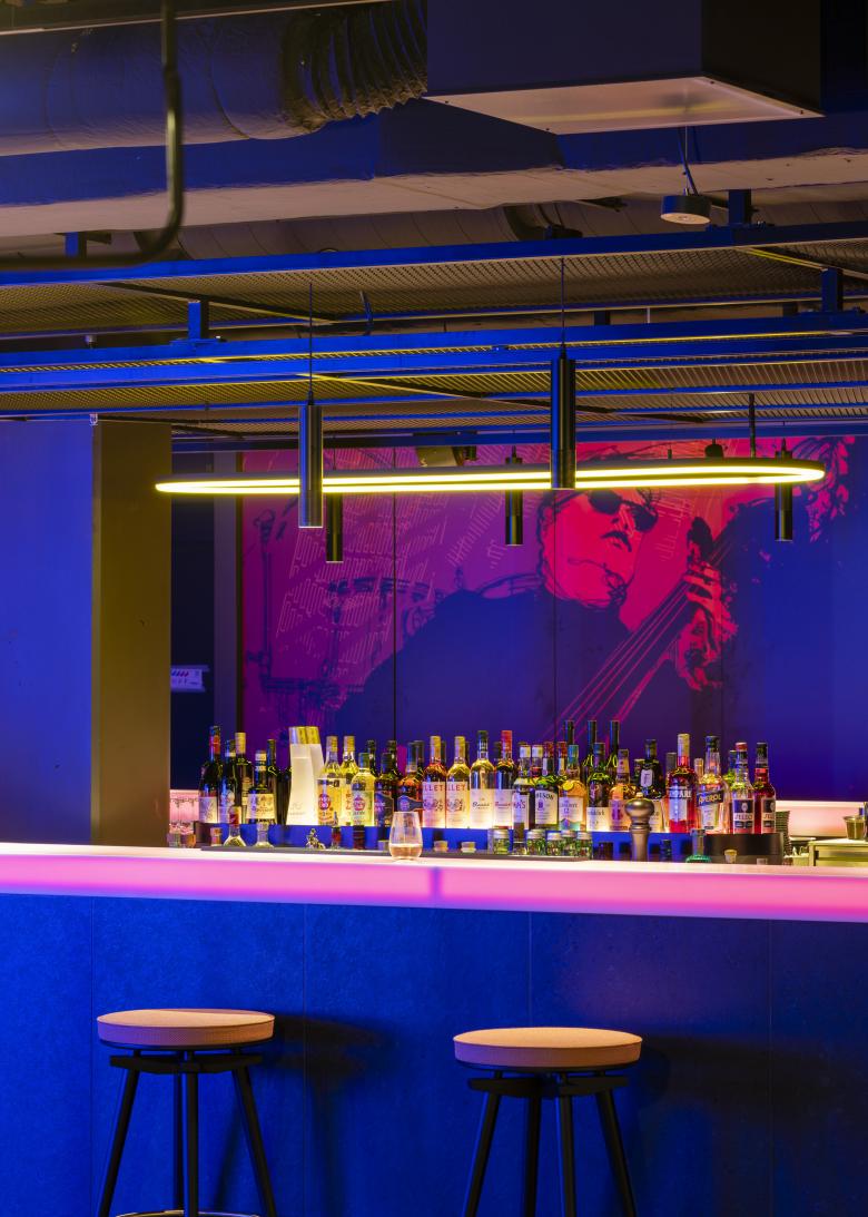 Große Öffnungen zwischen Gang und Lobby auf der einen und dem Bar- und Frühstücksbereich auf der gegenüberliegenden Seite sind mit industriell anmutenden Rolltoren versehen, die je nach Bedarf hoch- oder runtergefahren werden. In ihrem urbanen, garagentorähnlichen Design betonen sie den allgemeinen Studio-Aspekt des Projekts. Der Gang führt zudem vorbei an einer offenen Küche mit der Leuchtschrift „Würstelstand“, an der morgens Frühstücksgerichte und abends Streetfood ausgegeben wird. „Das Jaz in the City soll ein Ort sein, der sich stark mit der Stadt verbindet“, fährt Architekt Bernard fort, „ein Treffpunkt für die heimische Szene gleichermaßen wie für Musiker und Musik-Enthusiasten aus aller Welt. Wer sich mit Musik beschäftigt, soll sich hier wohlfühlen und die Stadt Wien dabei auf vertrautem, musikalischem Territorium erleben.“ Geschehen wird das nicht zuletzt am Dach des Hotels, wo die Rooftopbar mit goldglitzernder Theke sich auf eine Terrasse mit Blick über Wien öffnet.