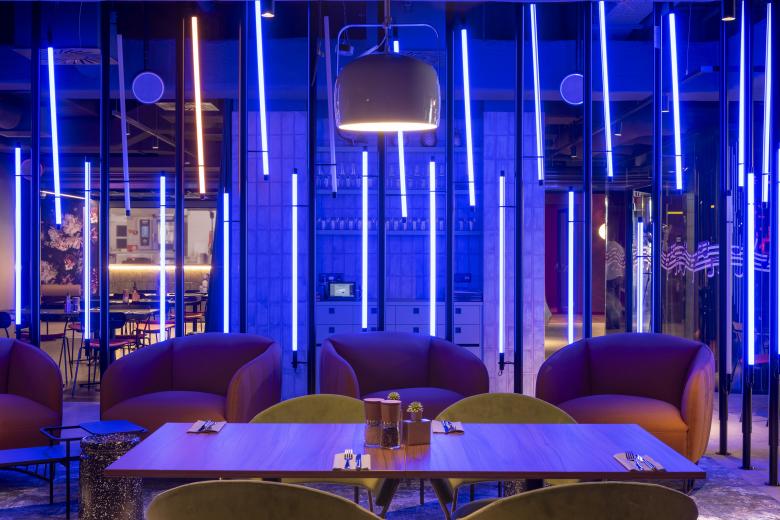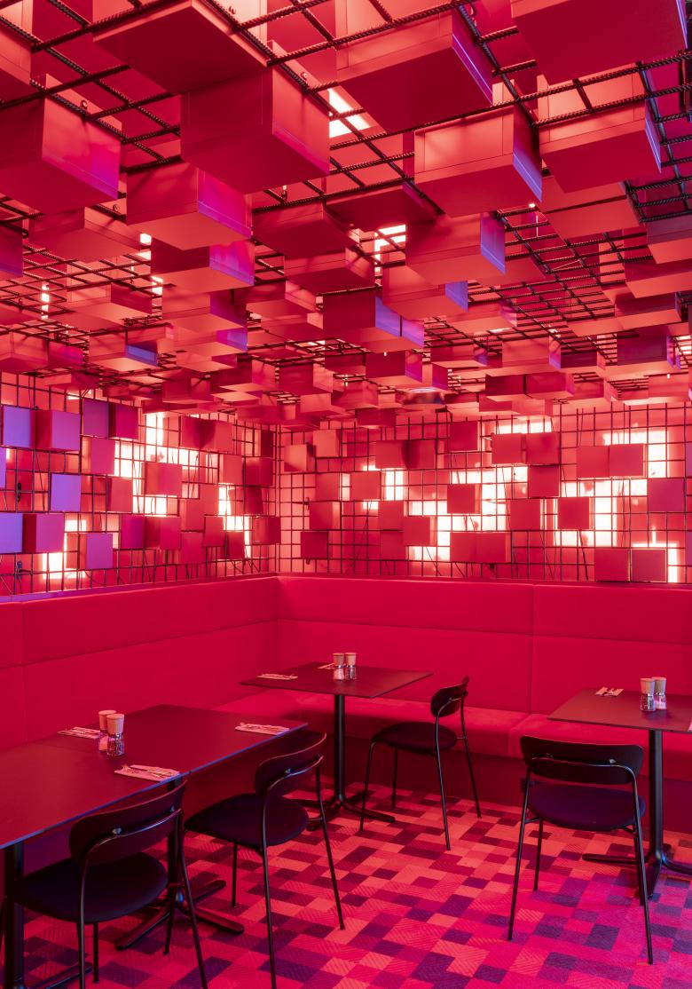 Fortgeführt wird das Konzept in so gut wie allen Bereichen des Hotels. So steht etwa im Zentrum der Lobby, links nach dem Entree, ein schallgedämmter Glaskubus, der optisch an ein Aufnahmestudio erinnert. Und sowohl als solches wie auch für Meetings und gegebenenfalls für Live-Sendungen genutzt werden kann. Gegliedert ist die Lobby in unterschiedliche Sitz-Inseln, die zum Teil wie offene Käfige von Mettalstangen umfasst sind, was eine gewisse Intimität erzeugt, ohne das Geschehen im Raum auszusperren. Entlang der Wand erstreckt sich der Red Amplifier, eine langgezogene Nische, die in verschiedenen Rottönen gehalten ist und an einen gewaltigen Verstärker erinnert.