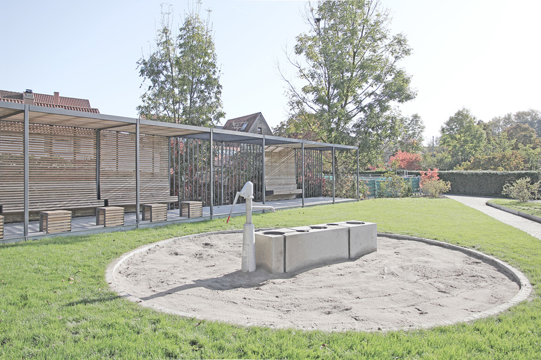 Der erste Schritt der Sanierung des Rathausumfeldes in Zaisenhausen war die Umwandlung des bisherigen Farrenstallareals in einen neuen Dorfplatz. Die bisher ungenutzte Wiese und der unbefestigte Parkplatz direkt neben der dominanten Kirche sollten funktional optimiert und der Öffentlichkeit besser zugänglich gemacht werden. Der nördliche Abschnitt mit direkter Verbindung zur Hauptstraße wurde großflächig mit Natursteinpflaster belegt und damit zu einem multifunktional nutzbaren und attraktiven Platz umgewandelt. Der bestehende Walnussbaum bildet den Übergang von befestigter Fläche zur Grünanlage, die östlich von einer Hecke und westlich von einer langen Pergola räumlich gefasst wird. Die neu angelegte Wiese kann nun über einen leicht geschwungenen Weg, vorbei an einem Sandkasten mit Wasserspiel, in Richtung Süden durchquert werden. Die Pergola bildet das räumliche und gestalterische Rückgrat der Freianlagen und lädt mit etlichen Sitzgelegenheiten zum Verweilen ein.