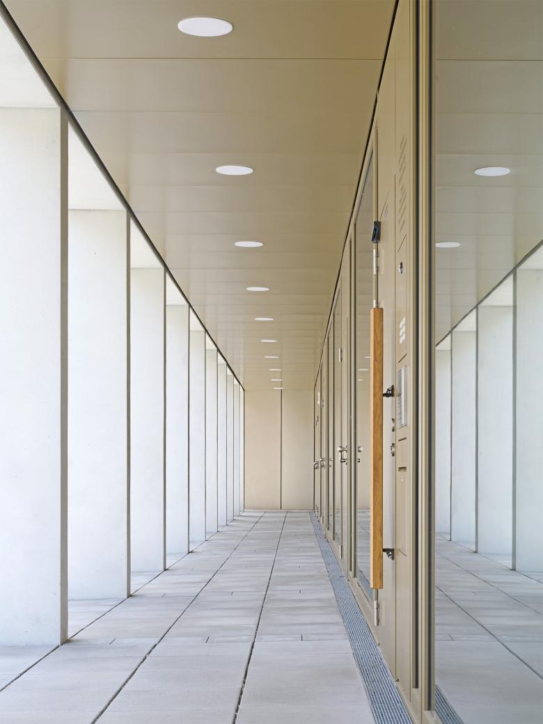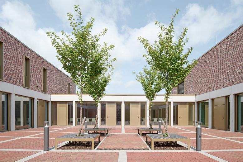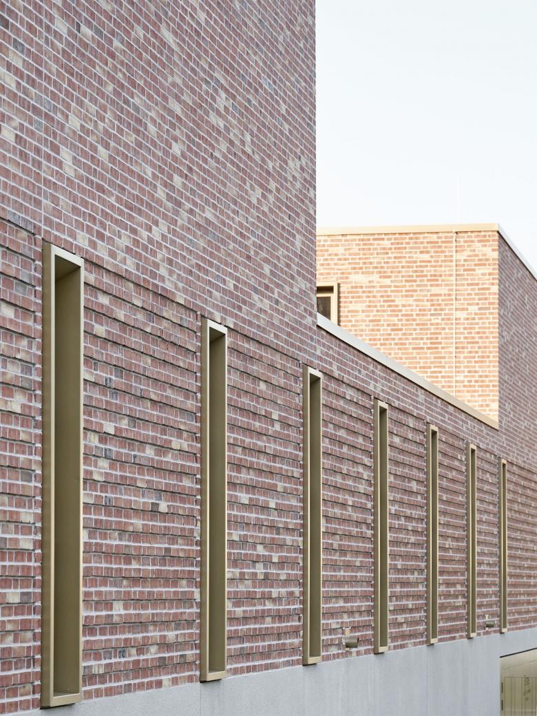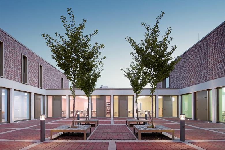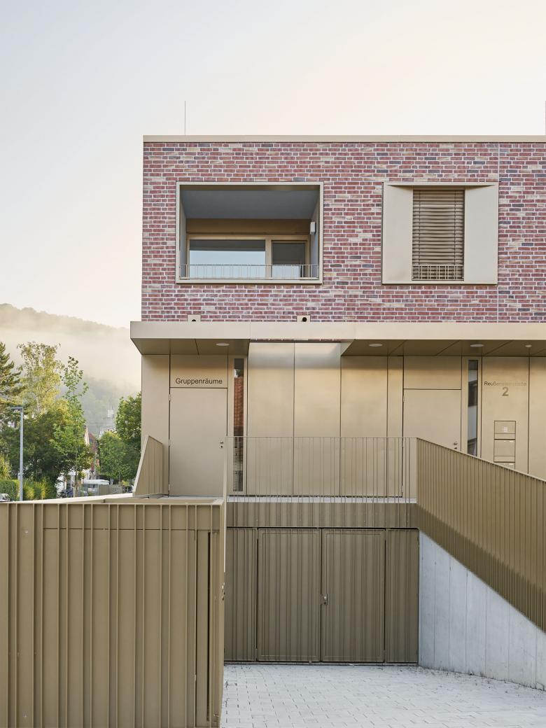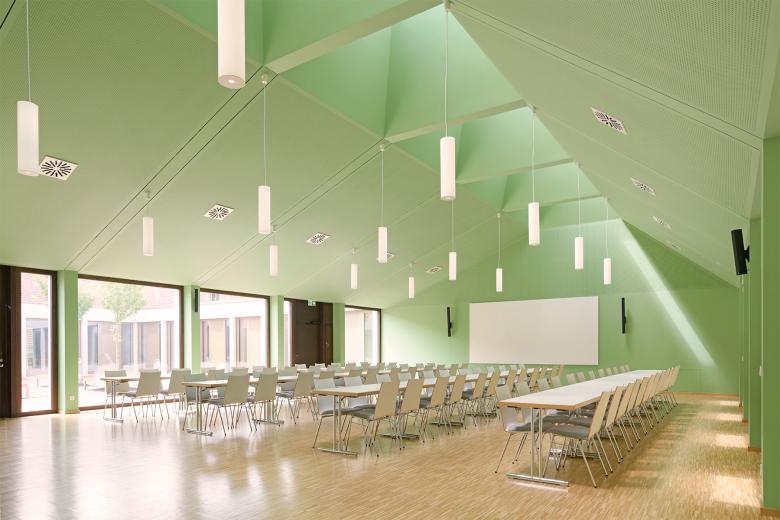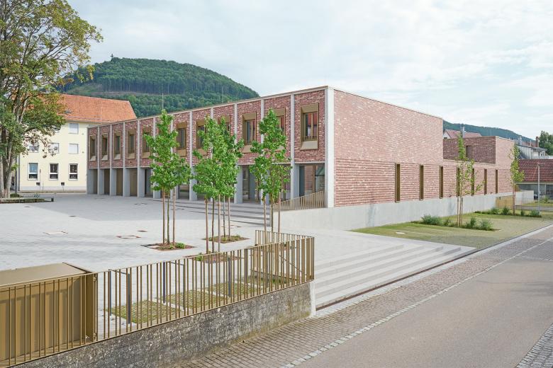 Im Zuge der in den vergangenen Jahren erfolgten Neuorganisation der Katholischen Gemeinden in Geislingen wurde beschlossen, den der Kirche benachbarten Gebäudebestand komplett abzureißen und durch ein neues Gemeindehaus zu ersetzen. Der kompakte Neubau öffnet sich mit einem wettergeschützten Vorbereich auf repräsentative Weise zur Kirche und bildet gemeinsam mit ihr ein prägnantes Gebäudeensemble. Zwei große Bestandsbäume und eine neu angelegte Baumgruppe verleihen dem neu entstandenen Kirchplatz eine hohe Aufenthaltsqualität. Das Zentrum der Anlage bildet der Gemeindesaal, der über das Foyer direkten Bezug zum Kirchplatz hat und sich auf der gegenüberliegenden Seite mit großen Fenster- und Türelementen zum zentral angeordneten Innenhof orientiert. Zusätzlich erhält er Tageslicht über sechs plastisch ausgeformte Oberlichtöffnungen, die den über zwei Geschosse reichenden Raum dominieren. Alle essentiellen Funktionsbereiche des Erdgeschosses öffnen sich zum ruhigen Innenhof, der mit seiner streng geometrischen Ausformung einen wohltuenden Kontrast zur heterogenen Umgebung darstellt. Um die Idee eines harmonischen Gebäudeensembles zu stärken, fiel die Wahl für die Fassadenoberfläche auf Verblendmauerwerk in Kombination mit Betonfertigteilen ähnlich der Kirche. Vor- und Rücksprünge in der Fassade sowie teilweise plastisch ausgeformte Oberflächen schaffen ein prägnantes Licht- und Schattenspiel.