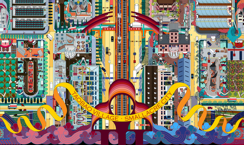 Taobao Village · Smallacre City is a large panorama created by Drawing Architecture Studio (DAS) for the exhibition of Building A Future Countryside at the Chinese Pavilion of the 16th Venice Architecture Biennale. Inspired by Broadacre City proposed by Frank Lloyd Wright in the 1930s, DAS projects the realistic scenarios of Taobao Village in China onto the utopian plan of Broadacre City, combines the status quo of the very Chinese countryside and classic American avant-garde architectural design, and mixes the underlying folk wisdom with the top elite thinking. To DAS, Taobao Village is not only an irony and criticism to the impracticability of Broadacre City, but also an ultimate realization of the core concept of Wright’s utopia.