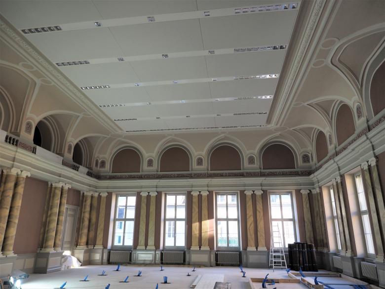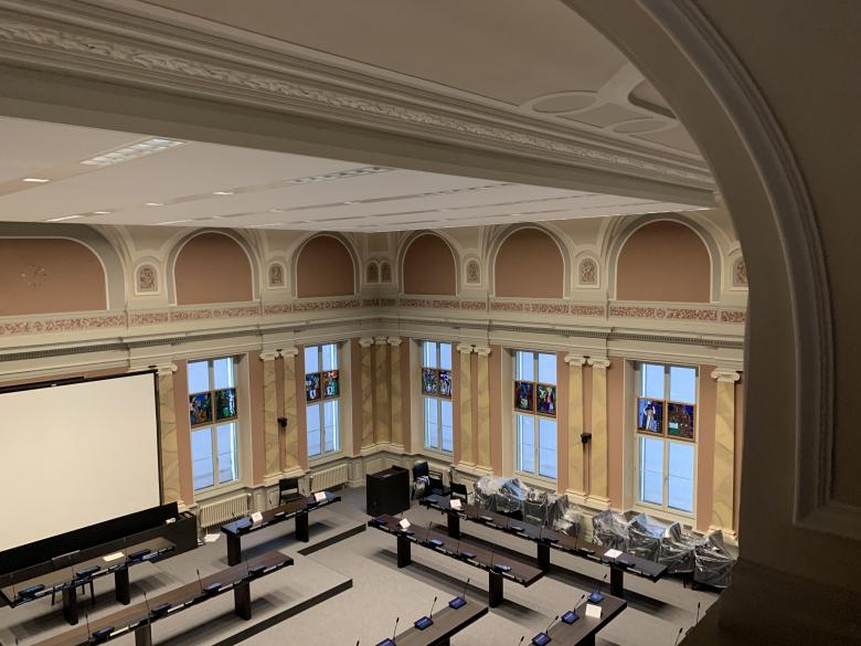 Gesamtsanierung Landratsaal im denkmalgeschützten Bestand mit zeitgemässer multimedialen Einbindung.