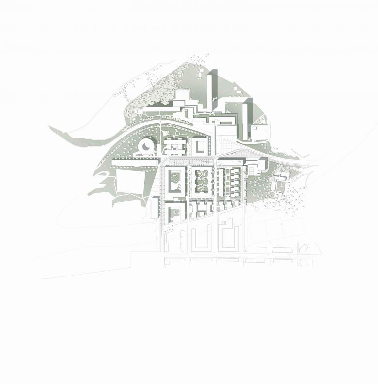 Das Projekt reagiert auf die duale Nutzung und die unterschiedlichen Anforderungen im Grundriss und der Erschliessung. Die Nutzungen führen jeweils über alle Geschosse und die unterschiedlichen Aussenräume werden in einer einheitlichen Fassadenstruktur aufgenommen.