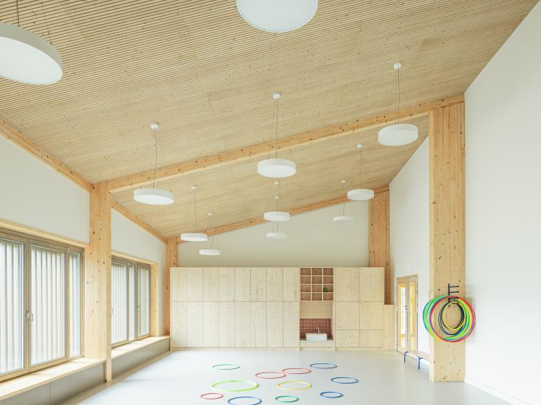 Die räumliche Gliederung der Schule in drei Baukörper, die durch transparente Brücken verbunden sind, führt zu einer klaren Orientierung und ermöglicht Sichtbeziehungen und Durchgänge zur Natur. Das Gebäude ist auf die Bedürfnisse von Kindern zugeschnitten.