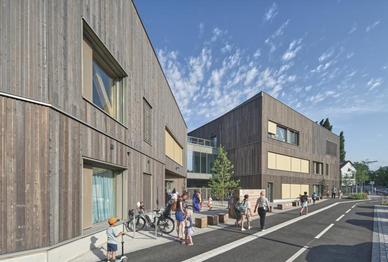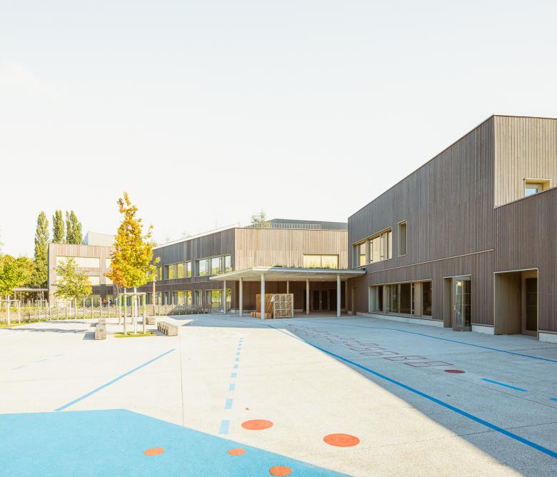Der Außenbereich mit zwei Höfen, Biotopen und pädagogischen Gärten ist erweiterter Lern- und Spielraum für die Kinder. Im Inneren bildet die zweigeschossige, lichtdurchflutete Bibliothek das Herzstück der Volksschule.