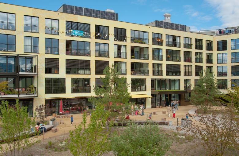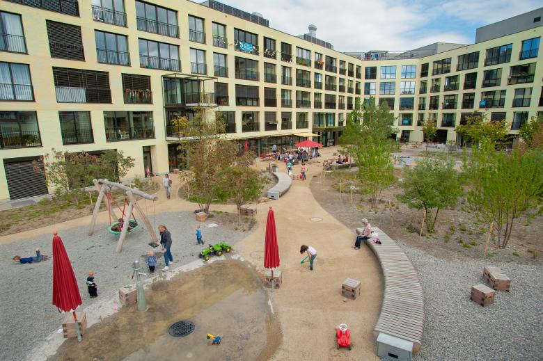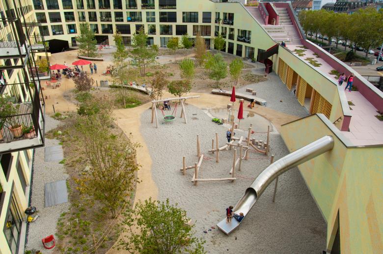 Der Wohn- und Gewerbebau Kalkbreite in Zürich bildet eine Hülle um das bestehende Tramdepot, das weiterhin in Betrieb ist. Das Freiraumkonzept wurde im Rahmen eines partizipativen Workshops zusammen mit der Genossenschaft Kalkbreite entwickelt. So laden nun offene, vielfältig nutzbare Flächen mit Spielplatz, Rutsche und lange Sitzbänke aus natürlichen Materialien und einem Teich zu gemeinsamen Aktivitäten, die teilweise von den Bewohnervereinen organisiert und mitgestaltet werden. Der mit Stauden, Sträuchern, Wiesenblumen und Bäumen bepflanzte Innenhof ist sozusagen das grüne «Wohnzimmer» des Quartiers, in dem die Bewohnerinnen und Bewohner das soziale Leben pflegen. Der umliegende Strassenraum bietet – gestalterisch mit dem Gebäude korrespondierend – Platz für Aussengastronomie sowie weitere Aufenthaltsmöglichkeiten.