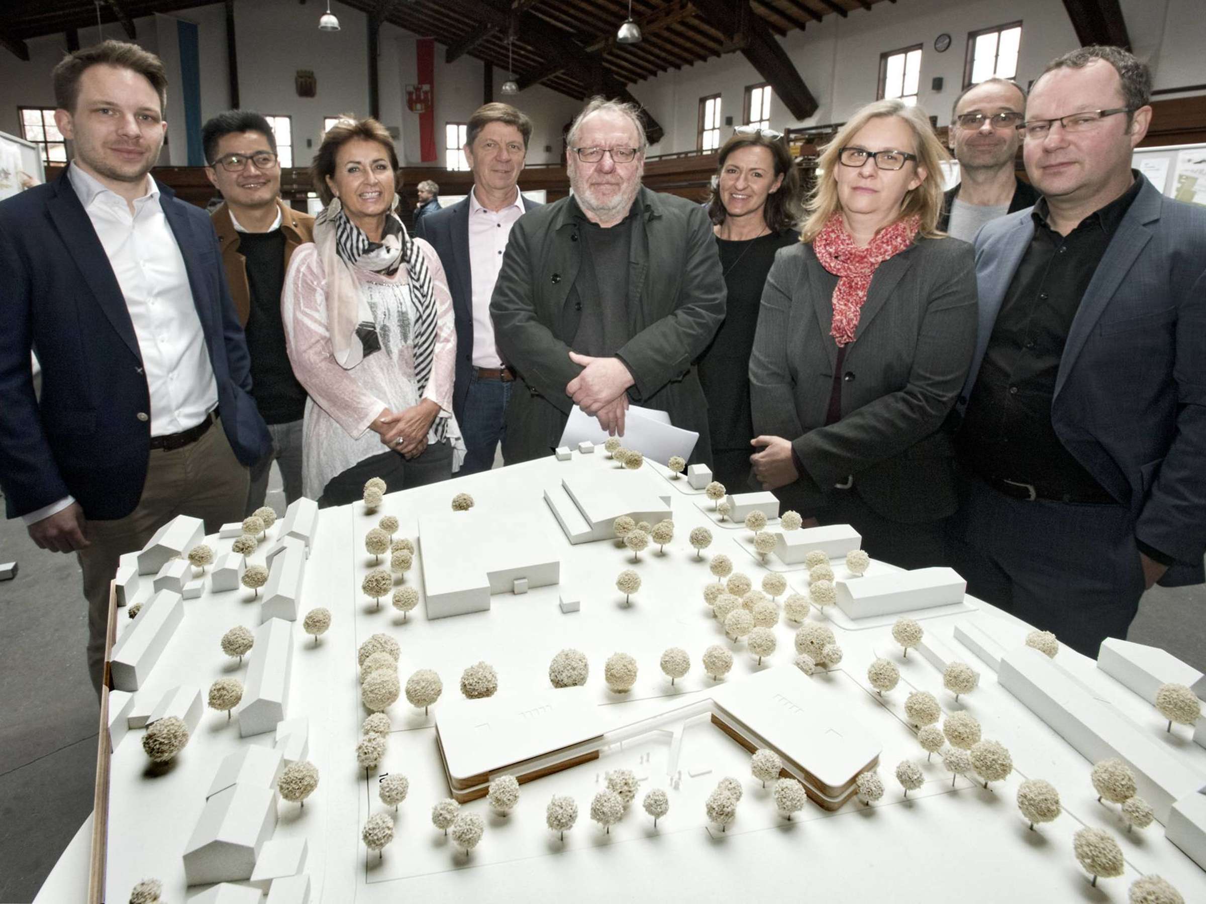 So sieht der Entwurf für die neue Halle (im Modell in der Mitte zu sehen) aus, den hier Arnd Rudolph und Stefanie Fuchs von der Partnergesellschaft Fuchs und Rudolph sowie OB Max Gotz (v. l.) zeigen. © Mayls Majurani