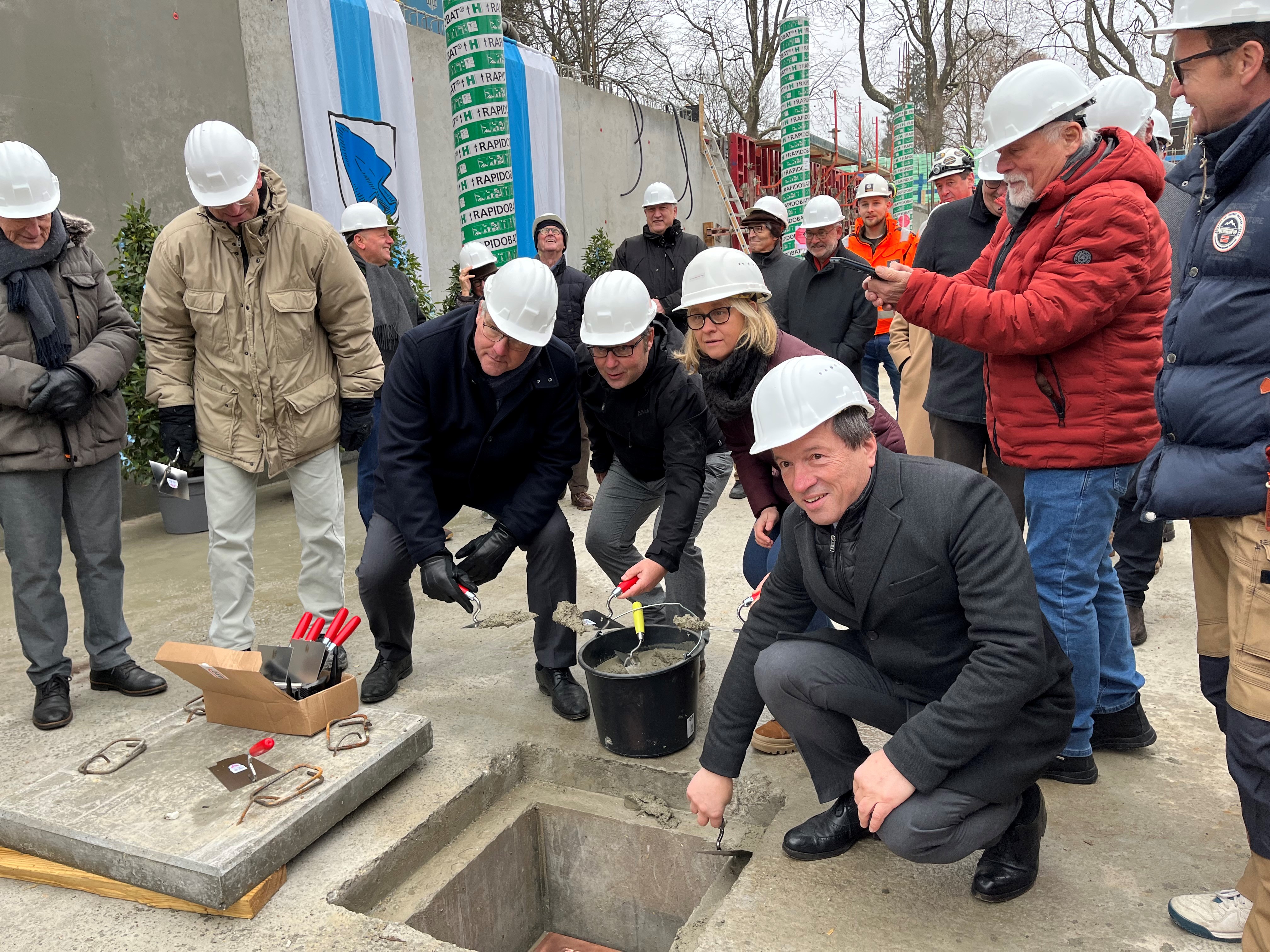 Feierliche Grundsteinlegung der Mehrzweckhalle in Erding. Die Münchner Merkur berichtet: