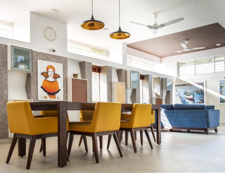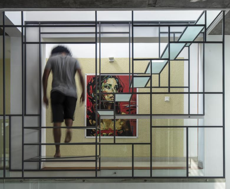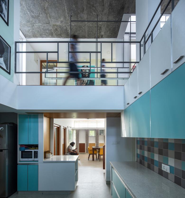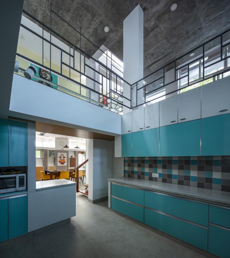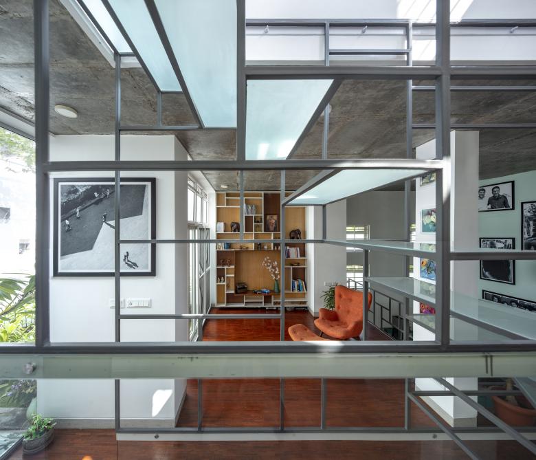 The mezzanine becomes the catalyst in developing the spaces of this house, as it hovers in between the long and open living cum dining on the ground floor and the private bedrooms on the first floor. The low height scales down the house, personalizes the gaze lines of interactions and dissolves the spaces as a gradation rather than a stack.