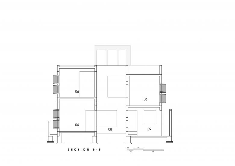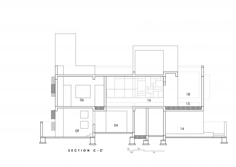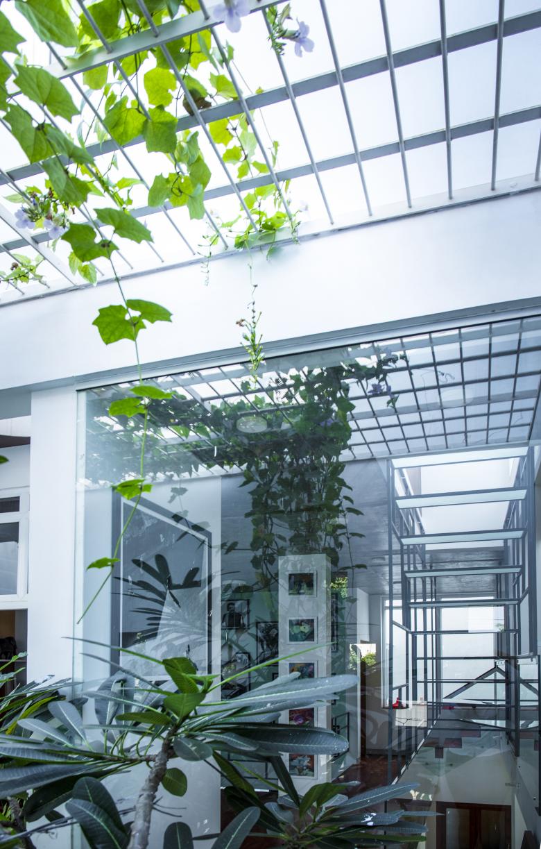 The Western block of the house is more traditional in terms of the stack. The Entry has a skylight from which one sees the plants above, on entering the house. It leads to large and long Living and Dining space which becomes the more formal and grander part of the house. The grandparents' bedroom is at the southern end of this block.