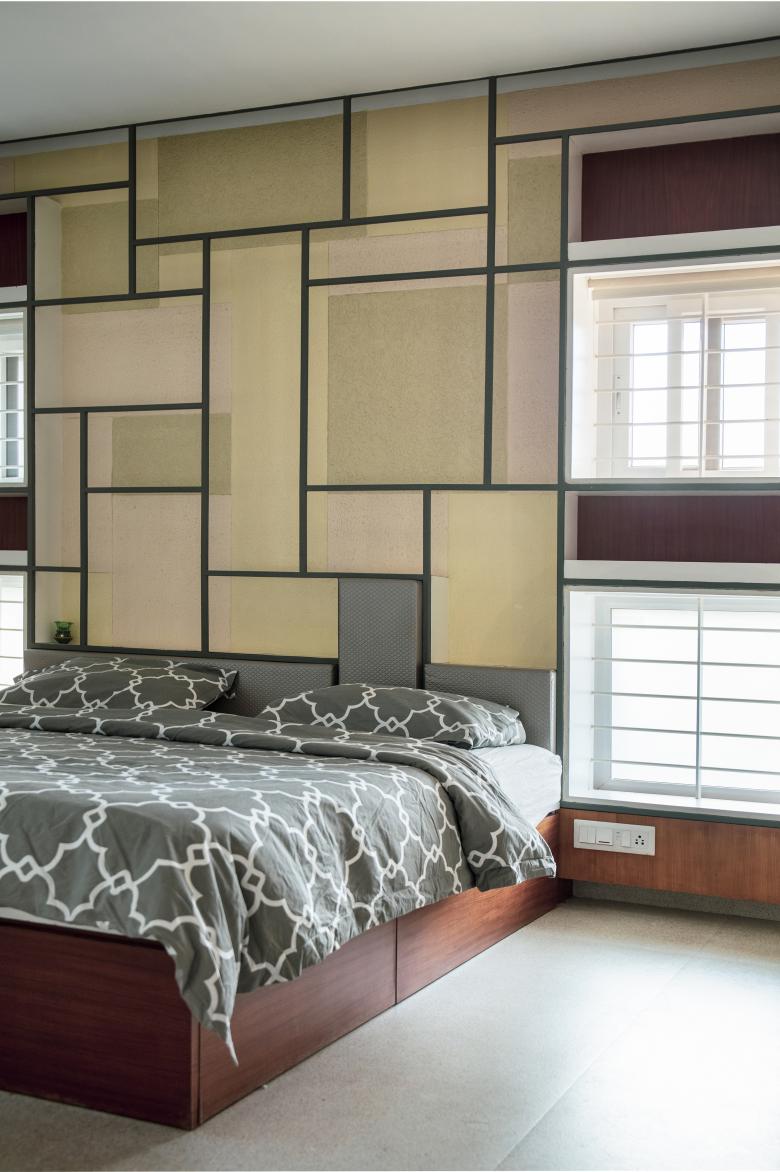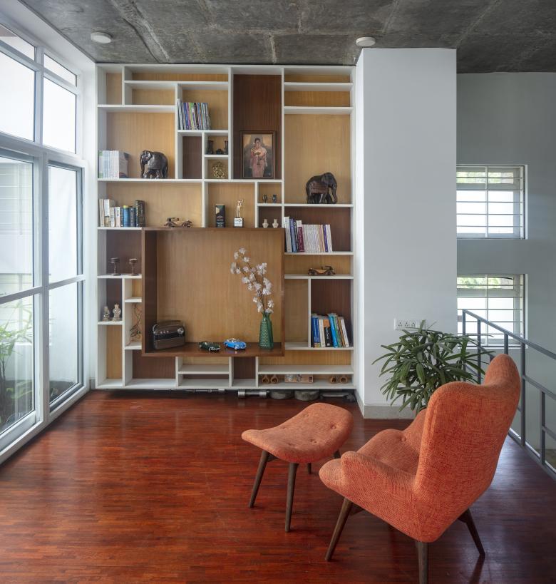 The mezzanine Bedroom is especially designed to 'keep an eye' on the old grandparents residing in the ground floor bedroom through a small courtyard which also serves as their 'private' garden, a light well and a back drop for Pooja / Temple.