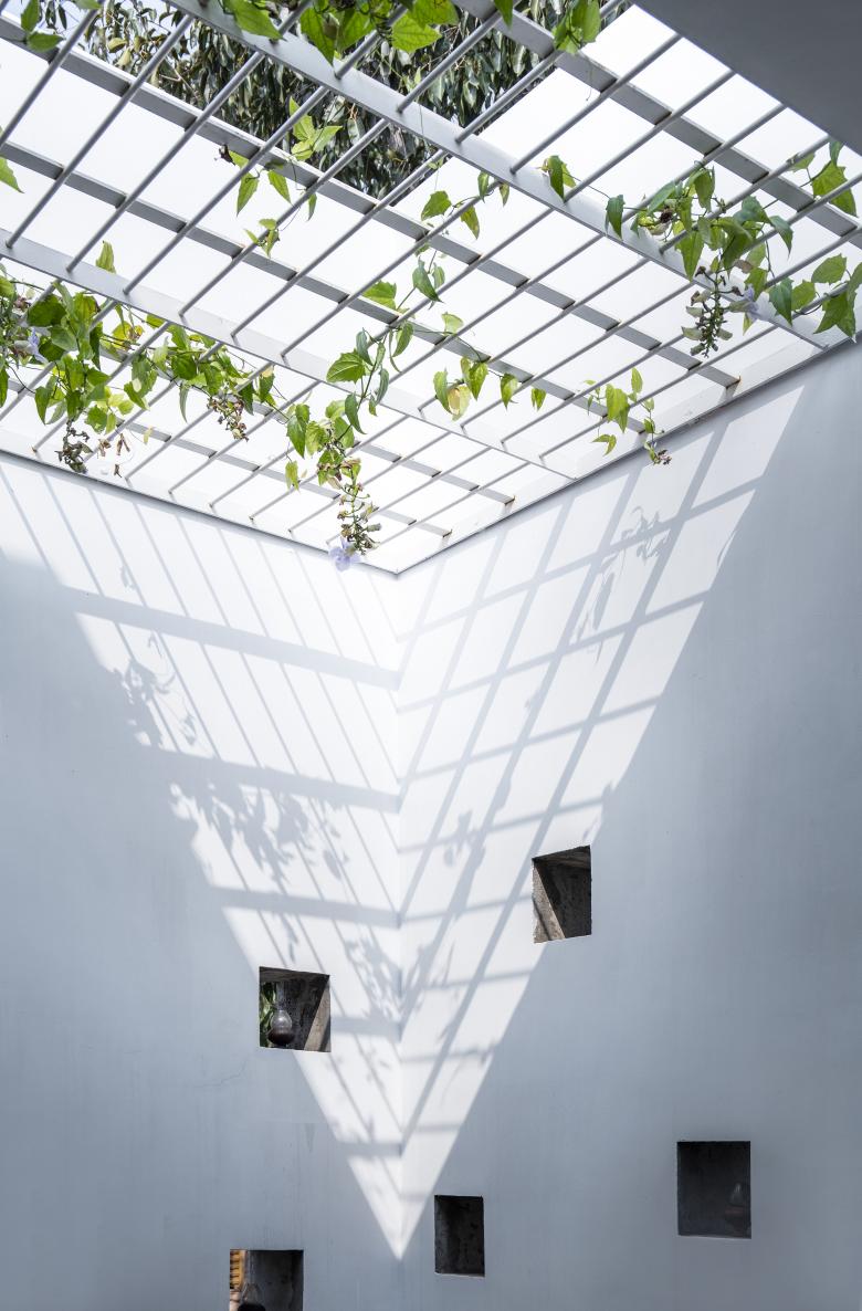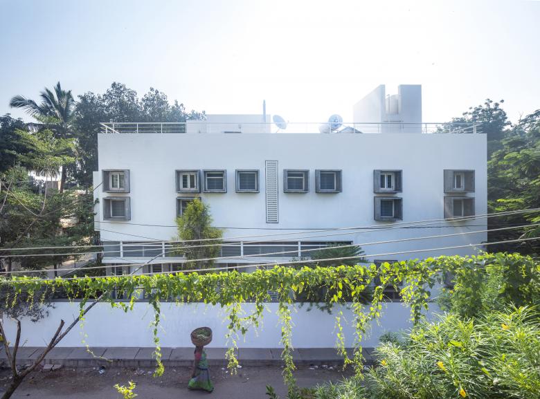 The house is designed to stave off the outside heat and create cool currents within it so as to form a convectional micro-climate. The outside walls wrap the house in this gesture of protection, pierced only with small and mass produced precast concrete windows that dot this exterior. The windows are kept small with heavy eaves to keep away the harsh sun.