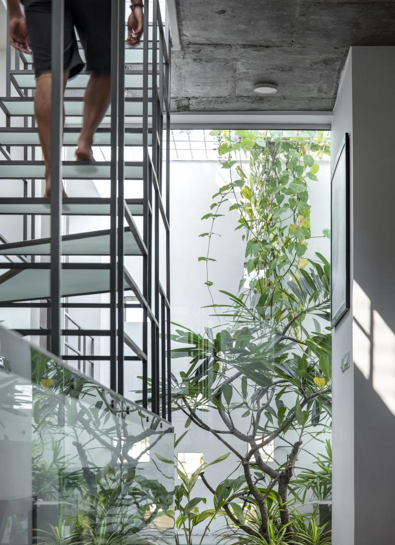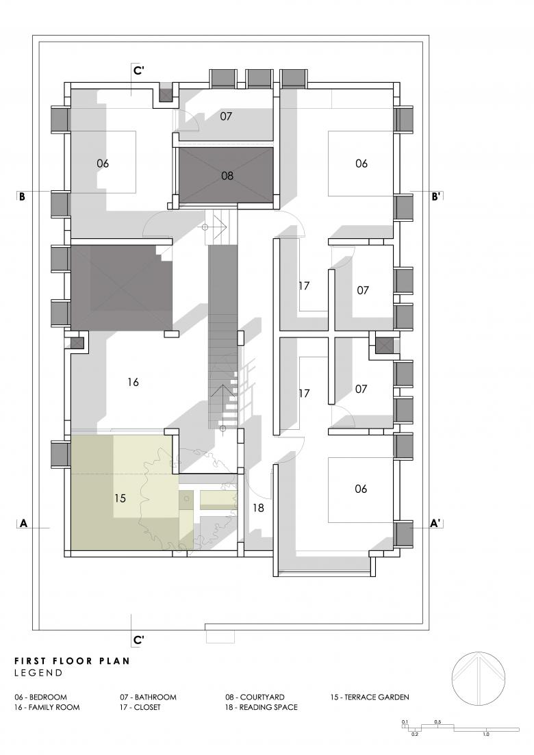 A elevated garden is set in the north east corner as a generator of this microclimate. It is kept open to sky in the shadow of the sun to create currents that flow through the house, just like the light that reflects into the house of its cool surfaces. This Terrace garden is on a mezzanine level as its serves both the ground and the first floor with this generosity of spirit and soft textures.