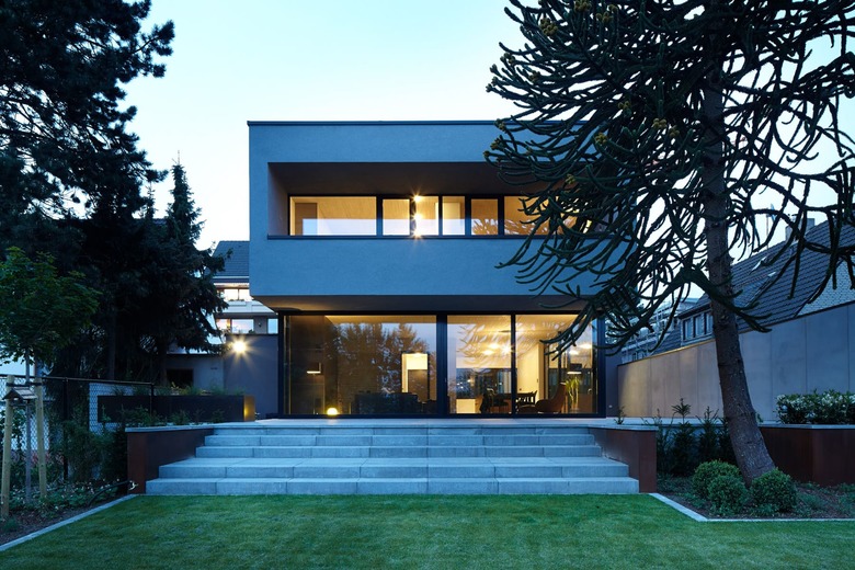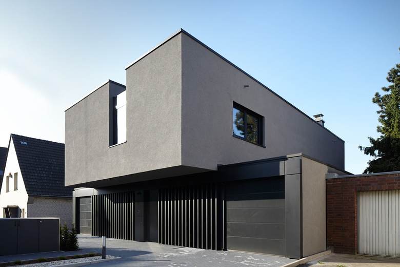 Das Gebäude wird aus zwei Kuben zusammengesetzt. Der erdgeschossige Kubus erstreckt sich parallel zur Strasse von einer Grundstücksgrenze zur anderen. So wird der Vorfahrtsbereich vom Garten klar getrennt. Über diesen Kubus wird ein zweiter in Längsrichtung des Grundstücks verlaufender Kubus gelegt. Dieser wird über seine vordere und hintere Überkragung des unteren Kubus klar definiert und erkennbar. Hierdurch ergibt sich ein vor der Witterung geschützter Eingangsbereich in das Haus und zum Garten hin ein witterungsunabhängiger Freisitz bzw. eine Terrasse.