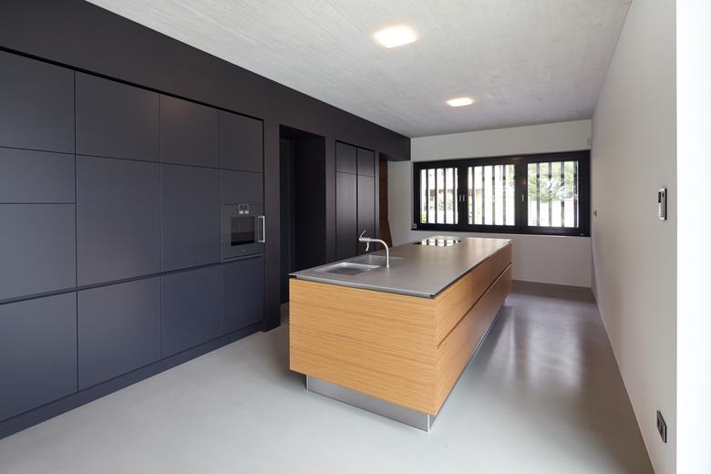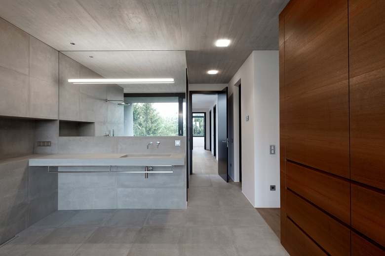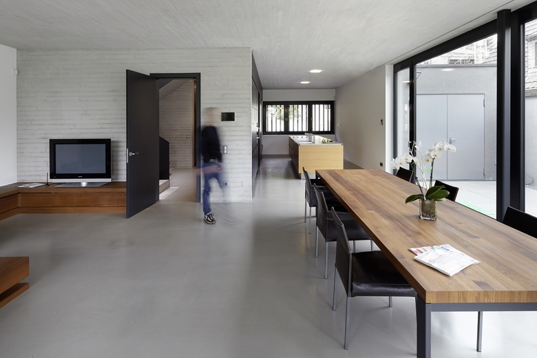 Die Innere Gestaltung wird vorwiegend geprägt durch die ausgiebige Verwendung von Sichtbeton für Wände, Decken, Treppen, bis hin zu den Waschbecken. Sämtliche Einbaumöbel wie Ankleiden, Garderoben, Boards, Schränke, Esstisch, Küchenanordnung sind vom Architekten geplant. Die Oberflächen im Erdgeschoß sind in Walnuss und im Obergeschoss grau beschichtet bzw. weiß lackiert gehalten.