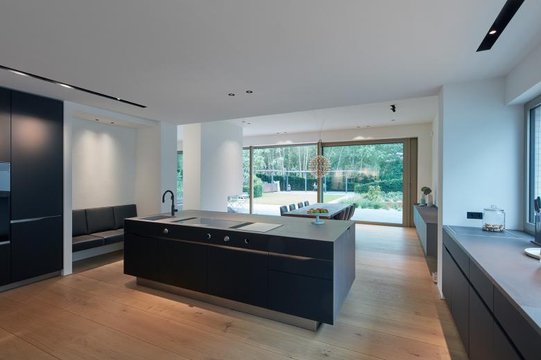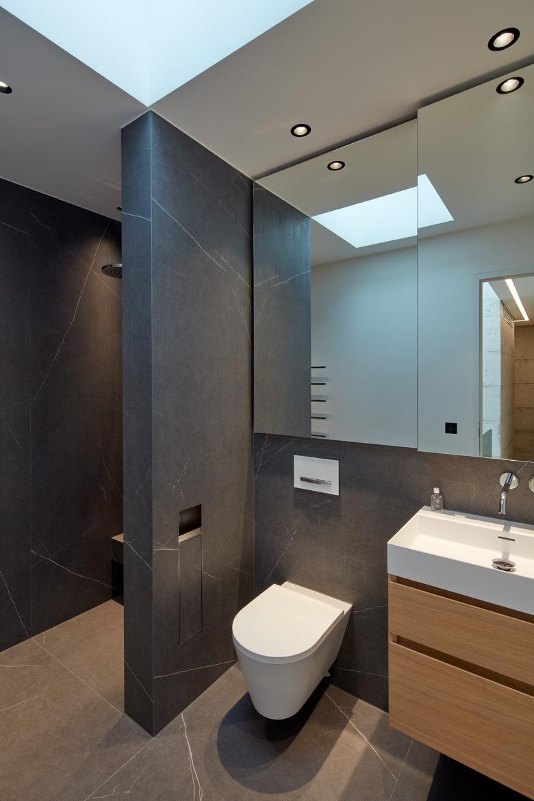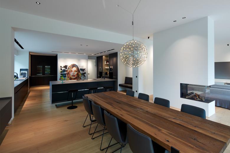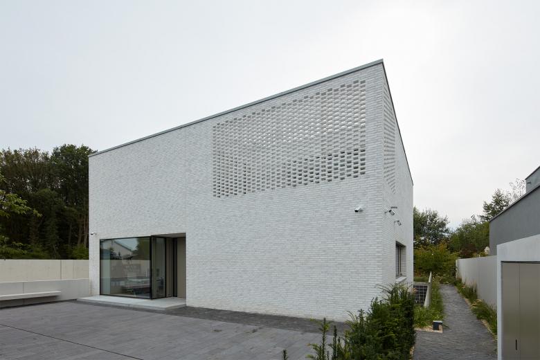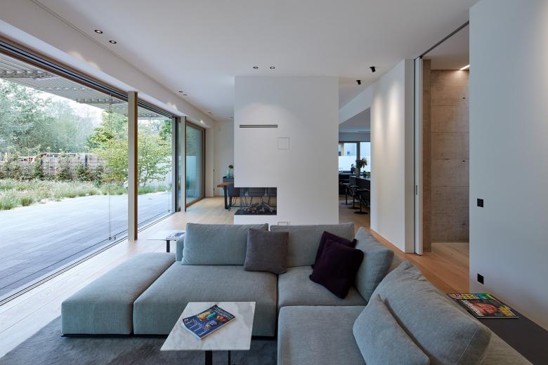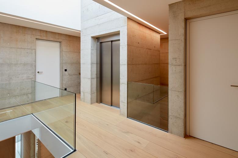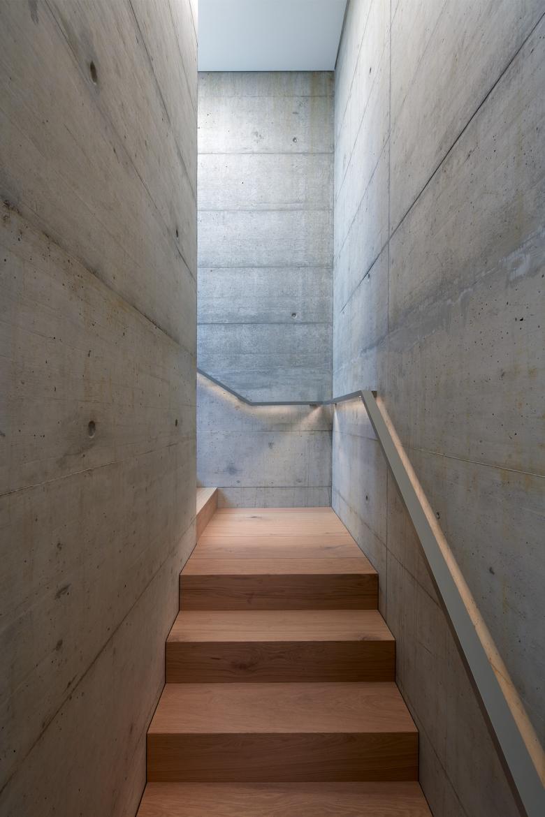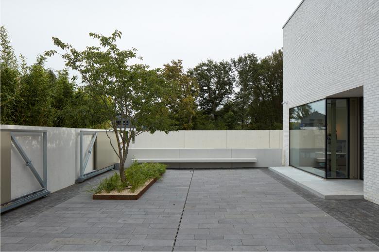 In einem reinen Einfamilienhausquartier sollte ein Einfamilienhaus für eine dreiköpfige Familie mit Hund errichtet werden. Der quadratische Baukörper, bedingt durch einen Bebauungsplan, zeigt sich an seinen beiden Seiten und zur Straße hin sehr geschlossen und öffnet sich zum Garten. Im Inneren sind alle Räume durch ein großzügiges Treppenhaus und eine Dachterrasse miteinander verbunden, belichtet und belüftet.