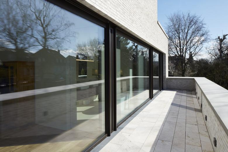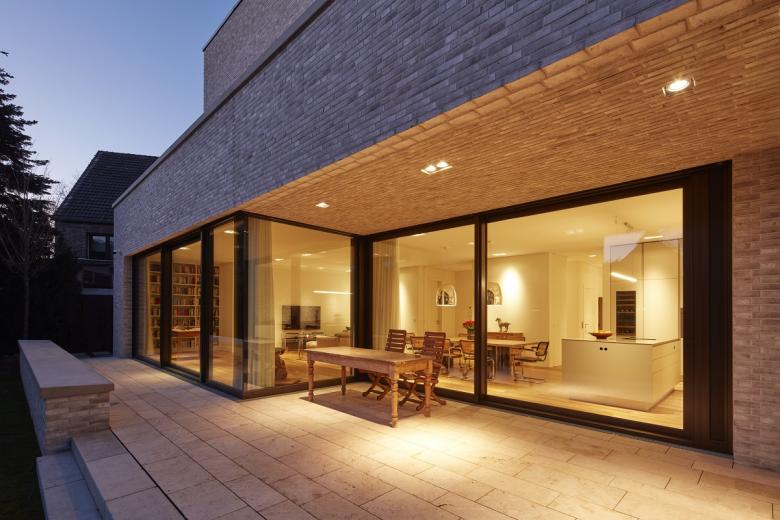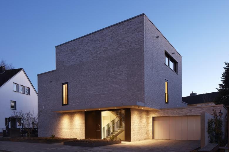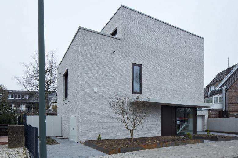 Das Gebäude erhält eine die strenge Kubatur unterstützende Klinkervorsatzschale und große Schiebefensteranlagen.