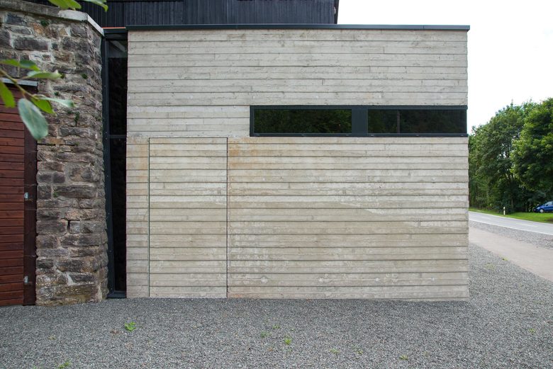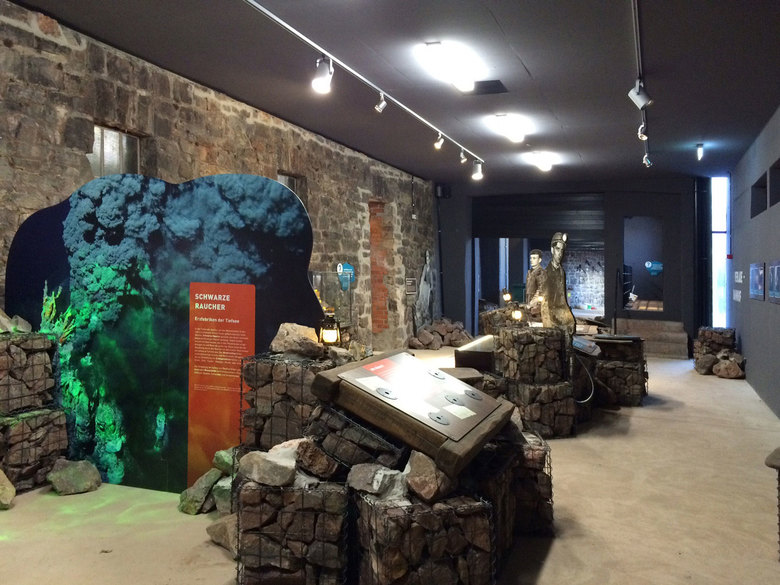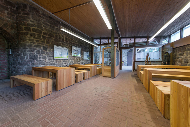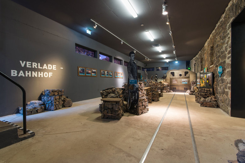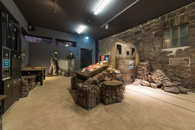 Der eingeschossige Anbau entlang der Straße verbindet den ehemaligen Erzbunker und den Lokschuppen der Anlage. Als Kontrast zum Bestand ist der Neubau aus Beton errichtet, der nur durch eine einzelne, gezielte Öffnung belichtet wird. Die einfache Kubatur des Anbaus mit seiner profilierten Betonfassade fügt sich harmonisch in das Gesamtbild der historischen Anlage ein. Der Innenraum bildet im Zusammenspiel von neuen Betonflächen, bestehenden Bruchstein sowie der Felswand und Mauerwerk einen spannungsreichen, idealen Hintergrund für die Ausstellungselemente. Die Ausstellung wurde komplett neu aufgesetzt und gestaltet. Sie ermöglicht dem Besucher einen „Rundgang“ durch die bewegte Geschichte des Bergwerks. Das Besucherbergwerk ist nur von April bis Oktober geöffnet, daher sind die Räumlichkeiten technisch einfach ausgestattet und unbeheizt.