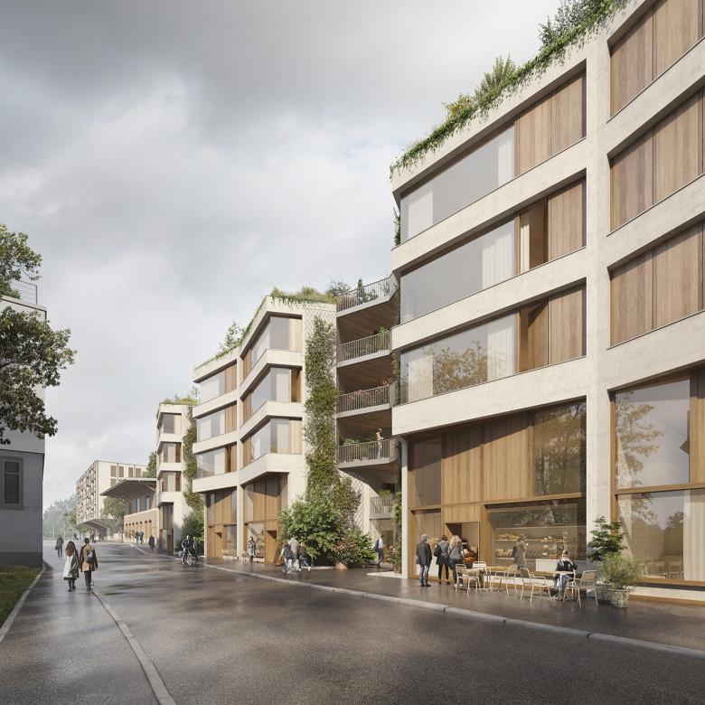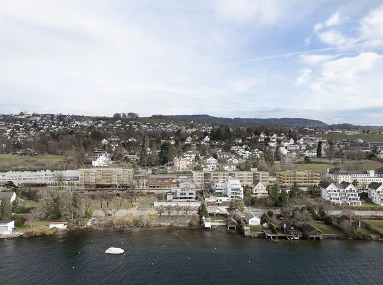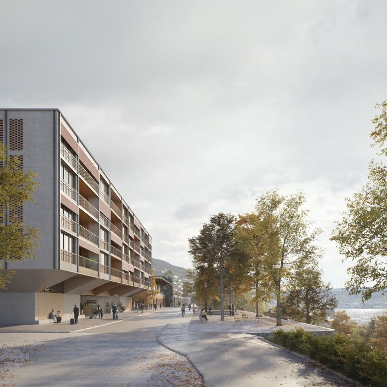 The General-Wille street, which leads from Meilen along the hill, over vineyards, under the railroad embankment, through old village centers, to the new Coop and railroad station – with niches and narrows, old walls and cobblestones, with a far-reaching view over the lake and an insight into the history of the place – is thus thought further. Also on the station area, its local character is restored, niches, greenery, and residential addresses are made possible up to the lake terrace, where it becomes a public place.