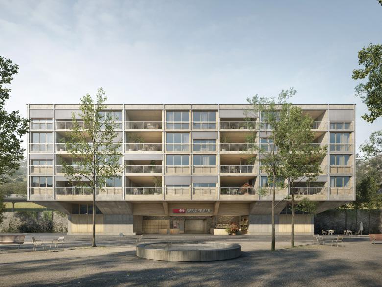 The current station building will also be given a new relationship to the street and, in the long term, will be replaced by a new building after the railroad infrastructure has been moved to the north. This will make possible a completely new, concise urban planning situation. The terrain shift from the track level to the new street level is accompanied by a retaining wall, which becomes part of the archaeology of the site. In part, the buildings stand in front of it, elsewhere the wall becomes its base. The terraced topography becomes the theme of the site.