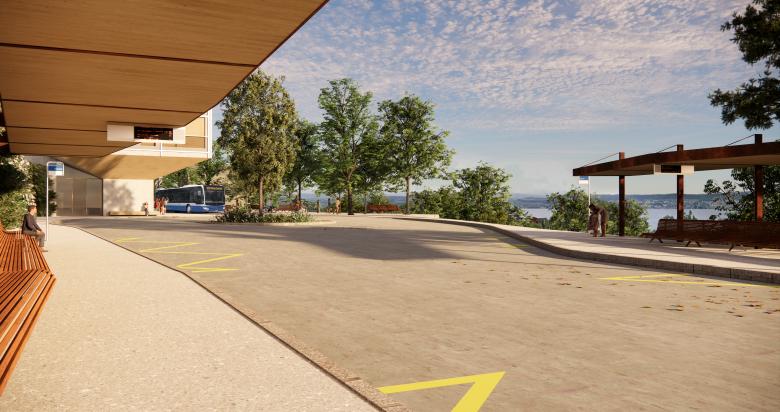 This place is made possible by clarifying and ordering the various elements. The lowered General-Wille Street will be widened in front of the station building to form a public lake terrace. The view towards the lake remains free. The central pedestrian underpass leads directly to the terrace, planted with trees and enlivened by temporary users. Arriving becomes an experience.