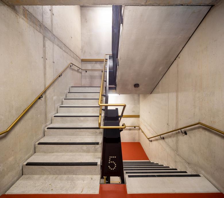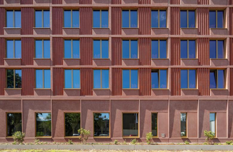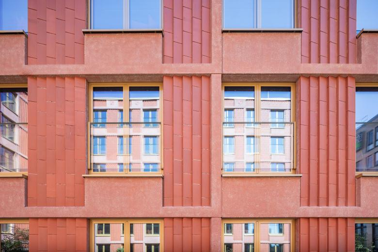 Mit einer witterungsunabhängigen Realisierung und einem durchgängig hohem Niveau der Produktion bietet modulares Bauen bekanntermaßen viele Vorteile. Ästhetische Qualitäten zählte bislang wohl kaum jemand darunter. Hier gehen Andreas Hild, Dionys Ottl und Matthias Haber neue Wege: Optisch entspricht die Fassade gewiss nicht dem Klischee des „Plattenbaus“. Vielmehr bestimmt die Präzision, in der die einzelnen Elemente gefertigt wurden, auch deren äußere Erscheinungsweise. Die schuppenartige Anordnung der Klinkerriemchen wäre in dieser Exaktheit vor Ort kaum zu realisieren gewesen. Sie zeugt inmitten der industriellen Fertigung von der handwerklichen Expertise des Herstellers, mit dem gemeinsam die Elemente entwickelt wurden.