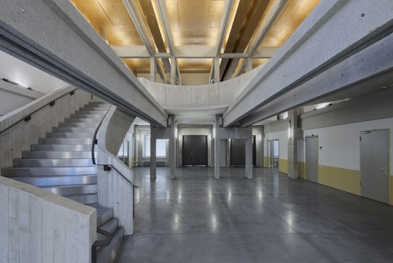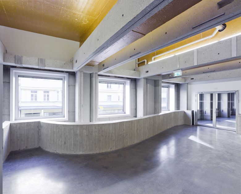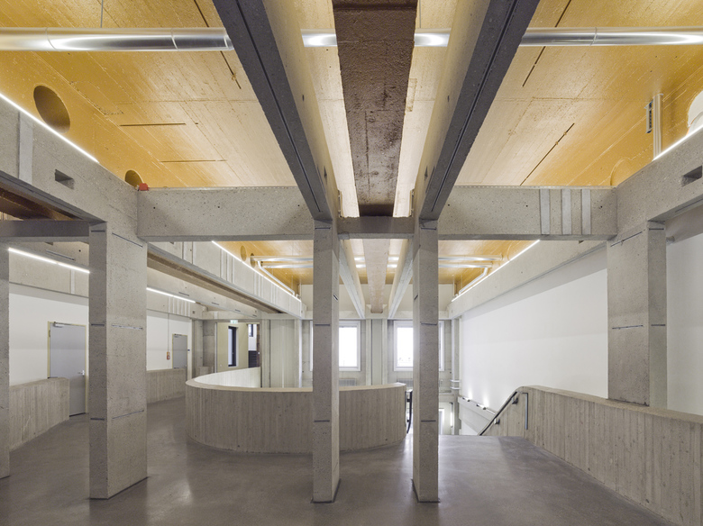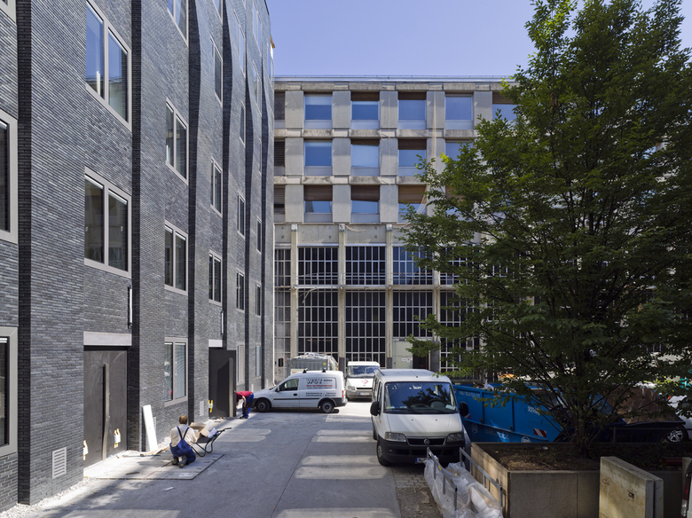 Im Inneren des Gebäudes wurde der sanierungsbedürftige Bestand bis auf das prägnante Stahlbetonskelett rückgebaut, die vorgefundene Gebäudestruktur optisch herausgearbeitet. Die hellen Gelbtöne der Flure, Seminar- und Büroräume nehmen Farben der umgebenden historischen Gebäude auf und schlagen somit einmal mehr eine Brücke zum architektonischen Kontext des Geländes. Großformatige Fenster unterstreichen die Bezüge von Außen- und Innenraum und sichern die optimale Tageslichtversorgung der Arbeitsplätze. Für ein behagliches Raumklima in den Büroräumen sorgt natürliche, vom Nutzer selbst zu regulierende Fensterlüftung sowie ein integrierter Sonnen- und Blendschutz. Hörsäle, Labore und Besprechungsräume erhalten eine Klimatisierung mit Wärmerückgewinnung. Zudem bezieht ein neu geschaffener Fernwärme-Anschluss das energetisch optimierte Gebäude in die Belange erneuerbarer Energien mit ein und trägt zusätzlich zur CO2-Einsparung bei. In einem zweiten Bauabschnitt wird bis zum Jahr 2013 ein weiterer Gebäudeteil entsprechend saniert werden. Der im Bestand zurückgesetzte Haupteingang wird dabei an den Straßenraum gelegt werden. Er soll in einen gebäudehohen Luftraum münden, der durch farbige, aus dem Bestand übernommene Kunstfenster eindrucksvoll inszeniert werden wird.