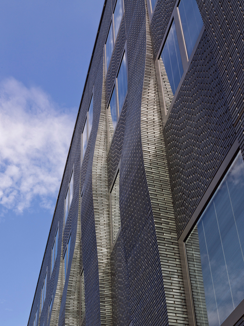 Die Fassade gliedert sich nun in Brüstungen und Pfeiler, welche die Flucht der vorhandenen Stützen aufnehmen. Ab dem zweiten Obergeschoss schwingen sie in die Ebene der Brüstungen zurück und reagieren so auf die bestehende Stahlbetonkonstruktion. Die maximale Auslenkung der Pfeiler wird in der Höhe leicht variiert. So entsteht im bodennahen Bereich ein starkes Relief, das sich nach oben glättet. Komplett fassadenbündig eingebaut integrieren sich die Fenster optimal in das Wechselspiel von Vorsprung und Fläche. Größe und Achsen bleiben gegenüber dem Vorgängerbau unverändert. Ein tintangrauer Vormauerklinker vermittelt zwischen den Sichtziegeln der Fünfziger- und Sechzigerjahre-Gebäude auf dem Nordgelände und den Aluminiumfassaden der technischen Neubauten auf dem Südgelände der TU. Zugleich dient sich seine metallisch schimmernde Oberfläche ideal dem durch die Ausbuchtungen der Fassade differenzierten Lichteinfall an. Insgesamt entsteht so ein lebhaftes, nuancenreiches Farbspiel. Daneben garantiert die vorgehängte Ziegelhülle mit Luftschicht und Dämmung einen hohen, den aktuellen Anforderungen an einen Neubau entsprechenden Wärmedämmstandard.