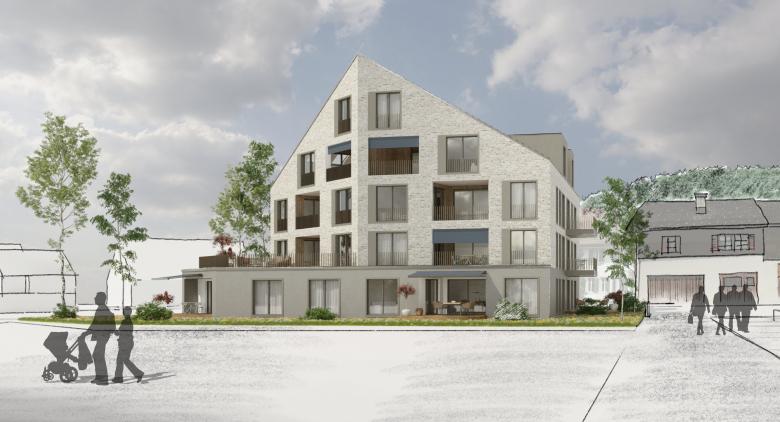 Der Form der Parzelle entsprechend reagiert auch das dreigeschossige Gebäude, indem es sich zu den kleinteiligen Strukturen im Norden schmal und in der Höhe geduckt zeigt. Zum Platz hin öffnet es sich und wächst in der Breite und der Höhe an. Der in der Winkelhalbierenden platzierte First steigt durch das gleichbleibende, relativ flach geneigte Satteldach stetig an. Die Giebelfassade im Süden wird durch einen leichten vertikalen Knick in der Flucht des Giebels in zwei gleichmässige Flächen gegliedert, was die Fassadenfläche kleiner erscheinen lässt und eine optimale Besonnung ermöglicht. Die nördliche Giebelfassade hingegen passt sich in ihrer Höhe und Breite der gegenüberliegenden Situation an. Das Erdgeschoss wird als Sockelgeschoss ausgestaltet, wie es auch bei bestehenden umliegenden Bauten typisch ist. Mit dem Gebäudesockel wird zudem die Höhenwirkung des Gebäudes stark reduziert.