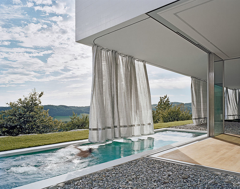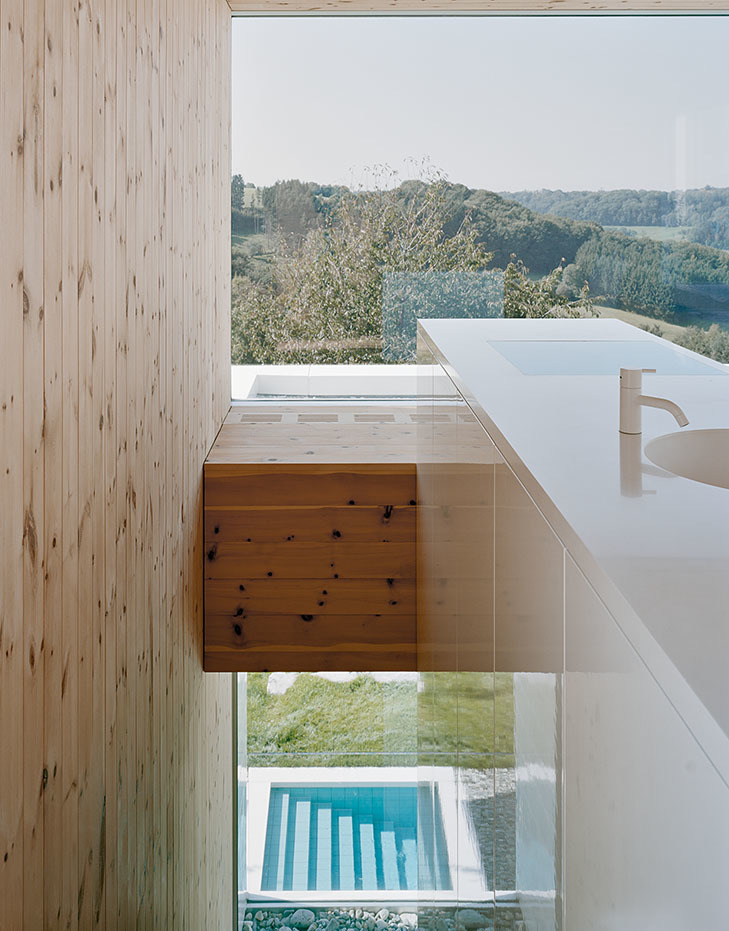 Vom Einfamilienhausgebiet ist dann nur noch wenig zu sehen. Offene Räume, eine raumhohe Verglasung mit dünnen Profilen, zoniert durch Stufen über die ganze Raumbreite, die in die Landschaft hinein führen, die Landschaft im Innern fortsetzen.